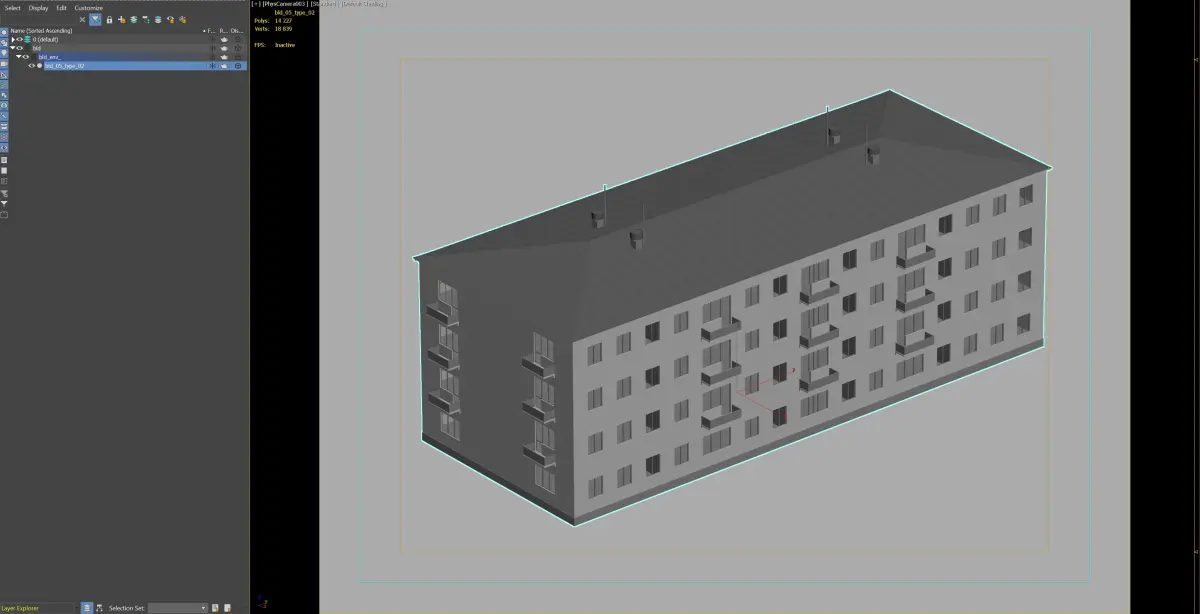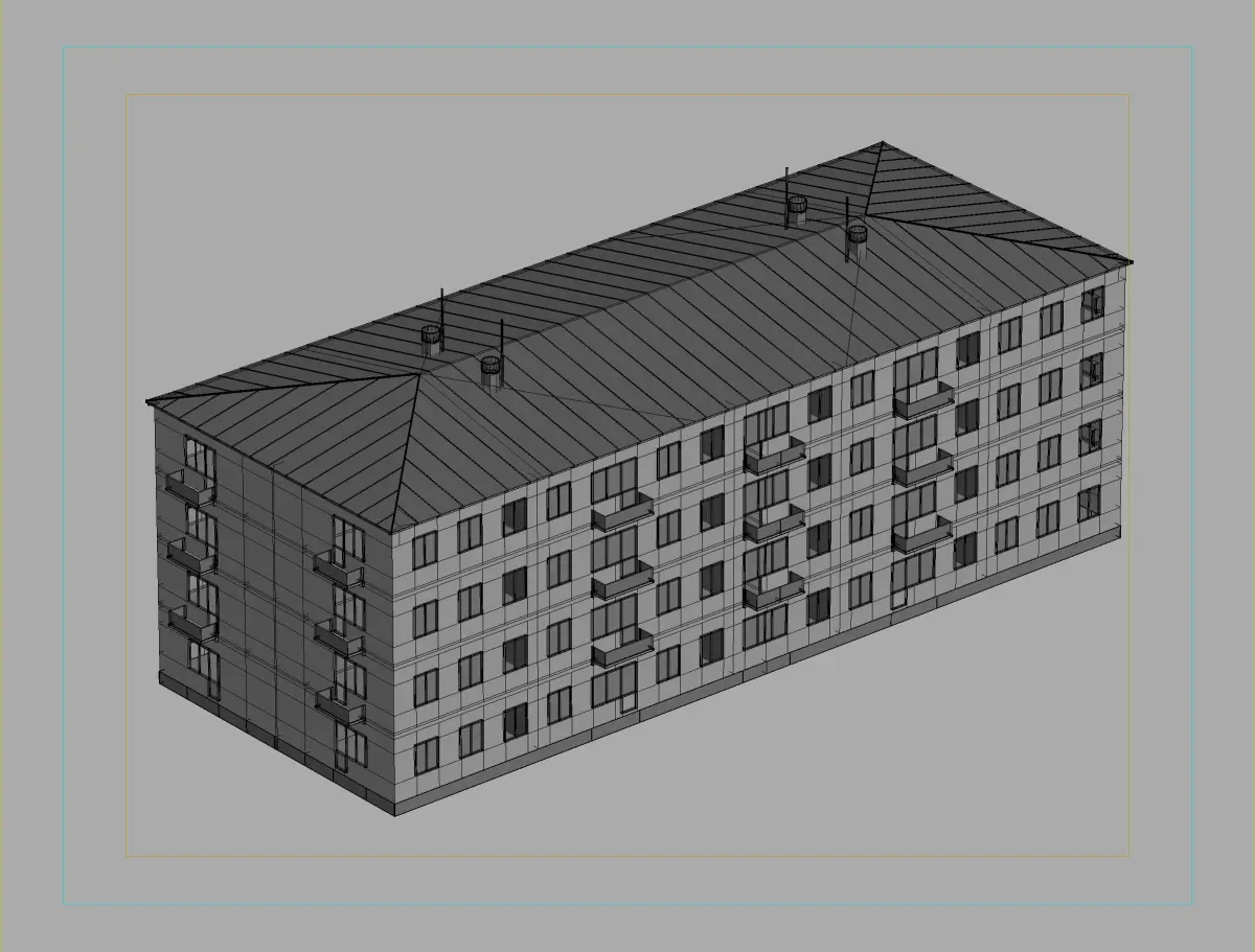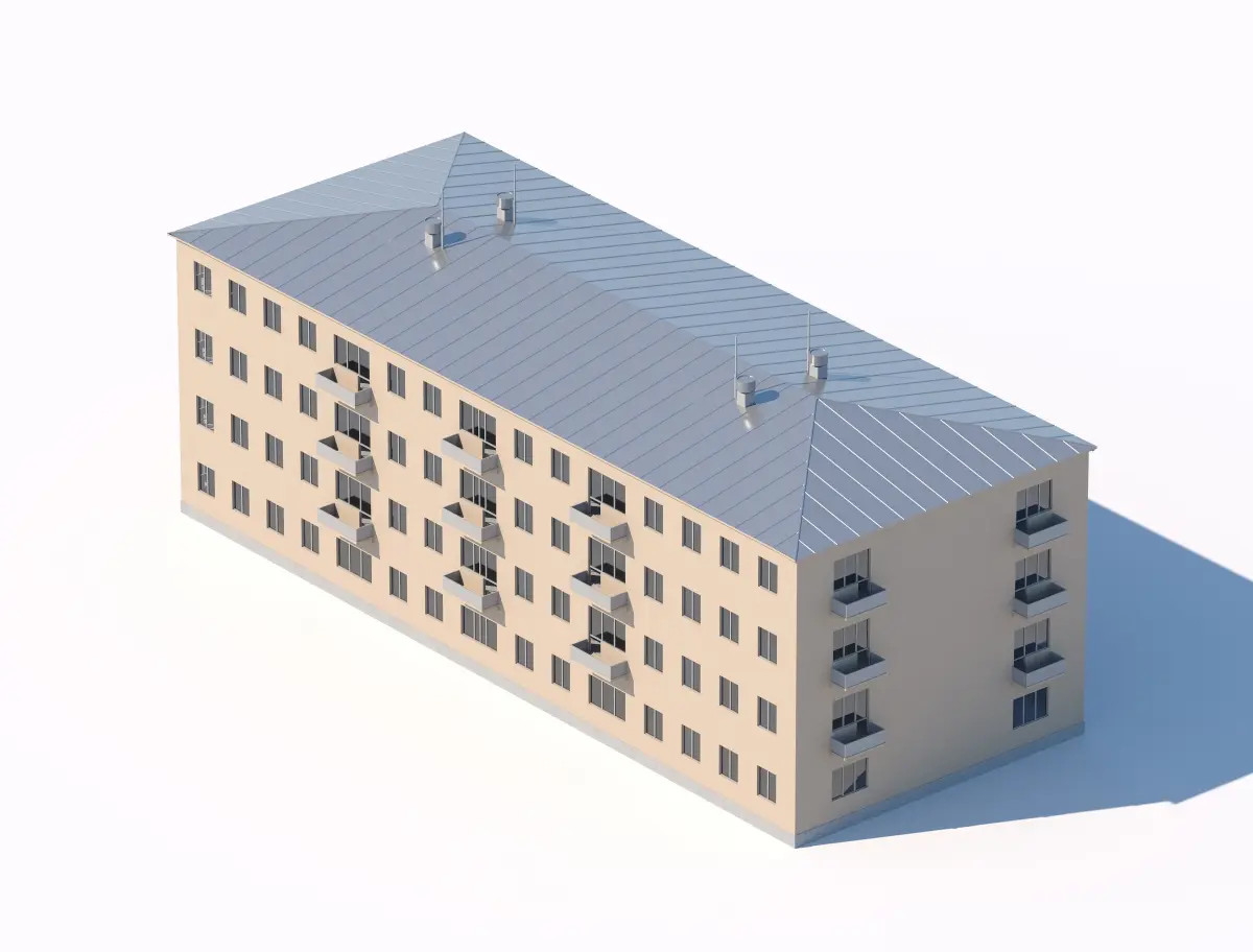 A realistic 3D model of a Soviet-era residential structure with a gable roof and detailed balconies, perfect for urban environment visualizations.
