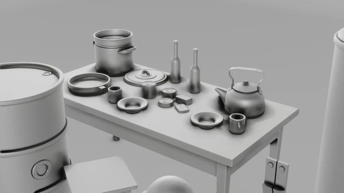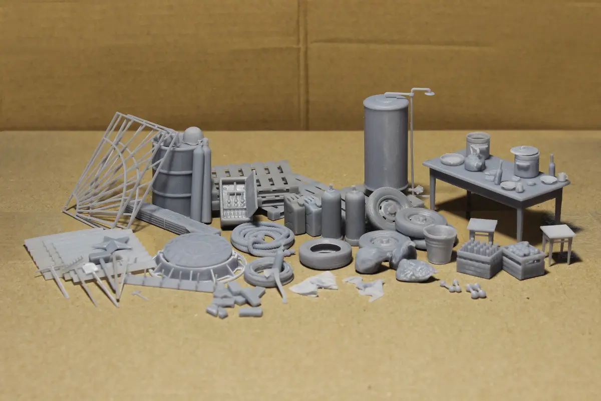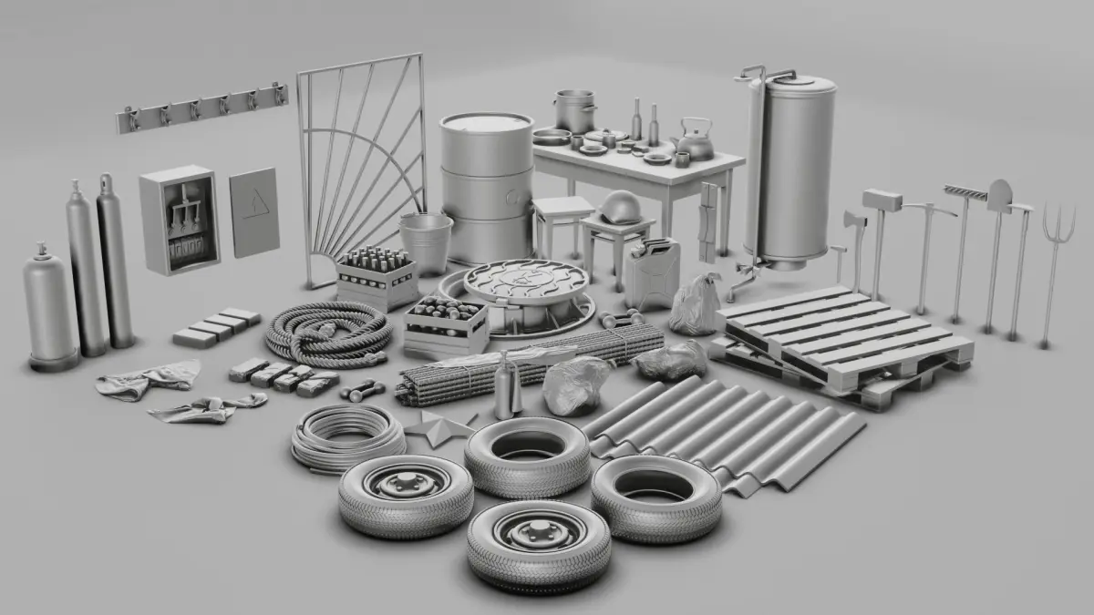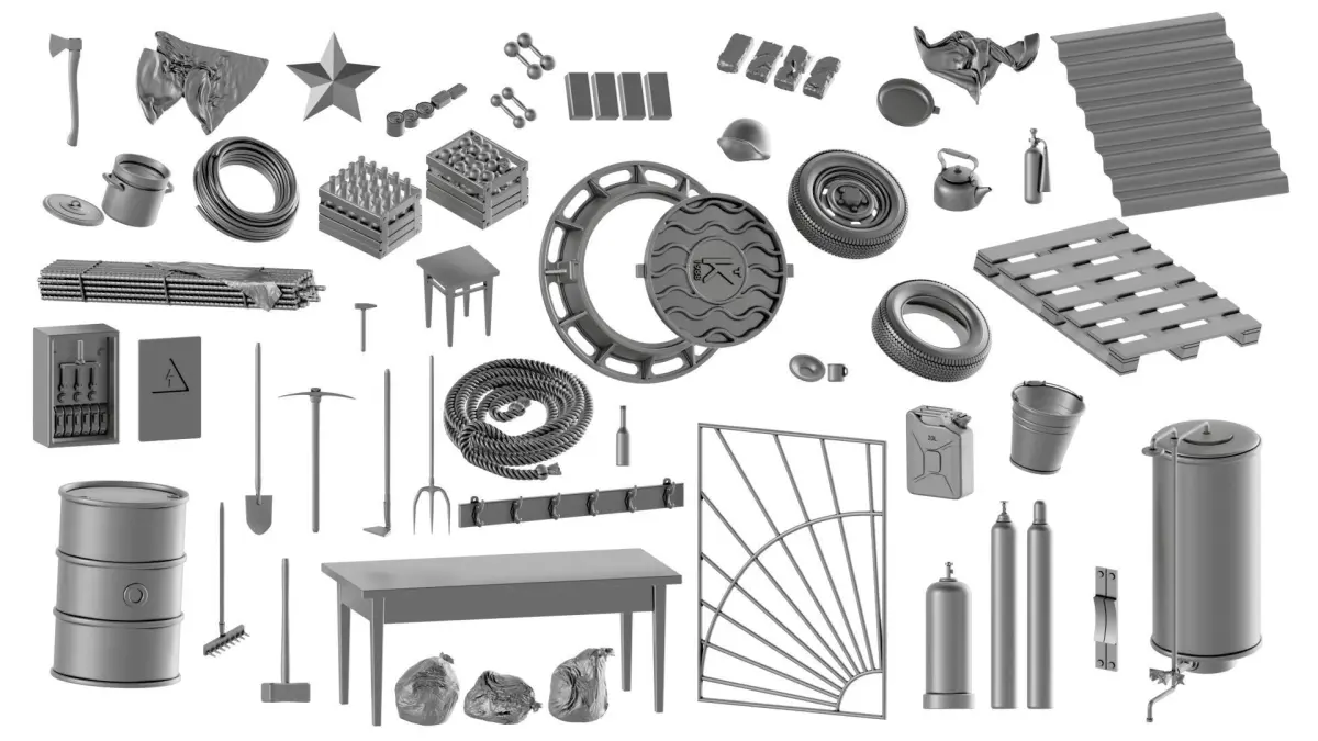 Rebar, Axe, Diesel tank barrel, Boiler, Bricks, Damaged bricks, Bucket, Canister, Canned food, Rags (2 types), Dumbells (2 types), Electrical panel, Fire extinguisher, Fruit box, Gas bottles (3 types), Hammer, Hanger, Helmet, Hoe, Hose, Kettle, Bowl, Cup, Manhole, Pallet, Pan, Pickaxe, Pitchfork, Pot, Rake, Rope, Shovel, Slate, Sledge, Soviet star, Table, Tabouret, Tire, Trash bags (3 types), Vodka box, Voska bottle, Wheel, Window cage.