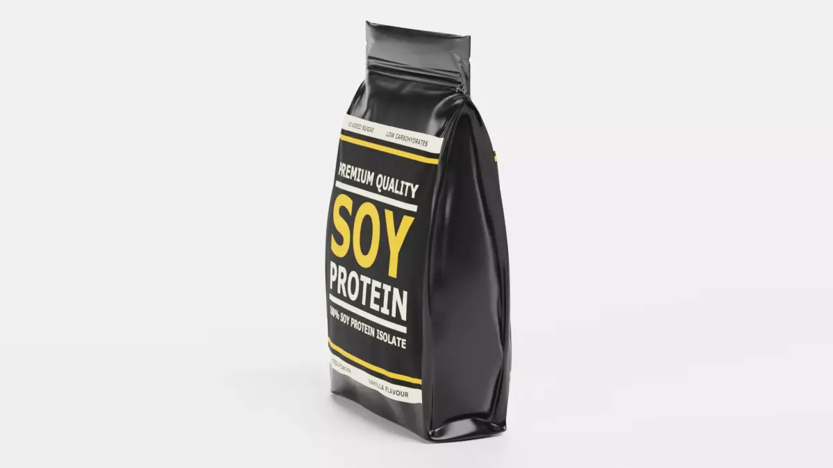 A realistic 3D model of a Soy Protein pouch designed as a brand-neutral supplement container with clean proportions and a production-ready look. This concept emphasizes modern, minimal design and accurate form factor, representing a timeless, professional packaging aesthetic for sport nutrition packaging – without any brand association.