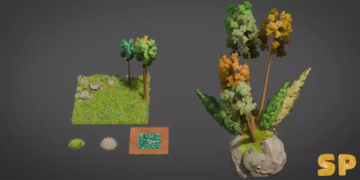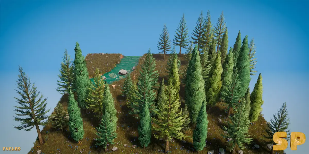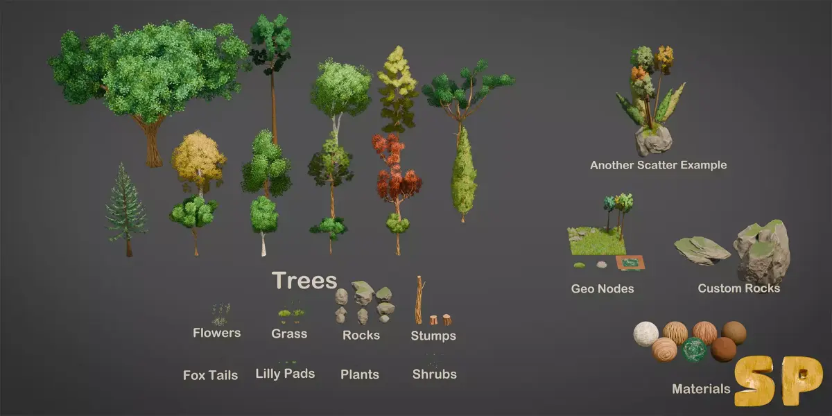 The SP Procedural Biome Scatter System is a stylized forest and environment toolkit for Blender, built around reusable assets, geometry nodes, and material-driven variation.