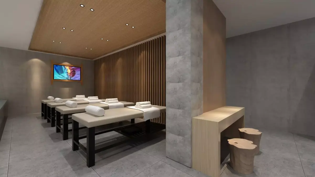 Interior scene of a spa room: massage set, pool, shower fixture, patio furniture set, vending machines.