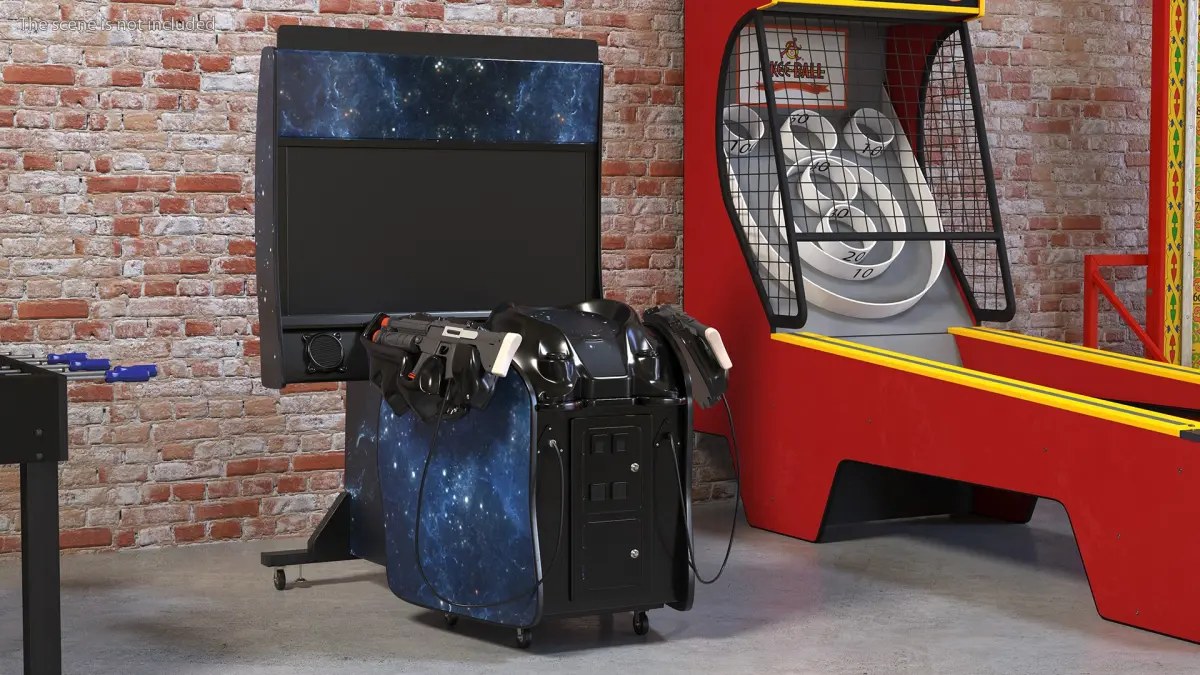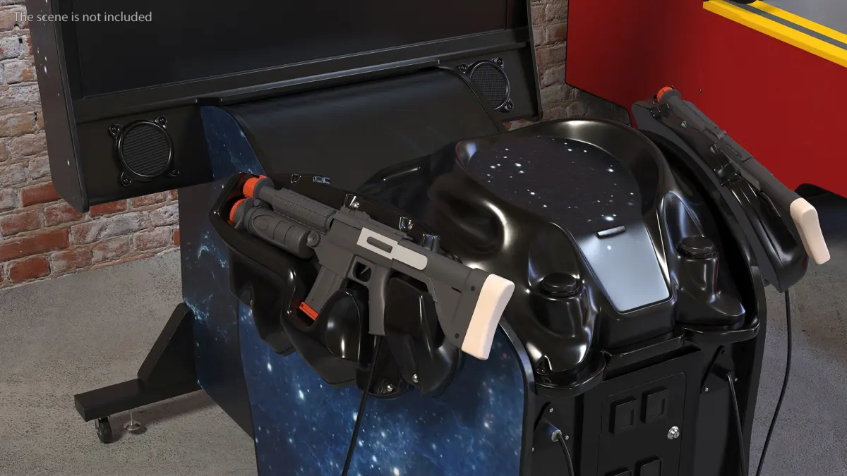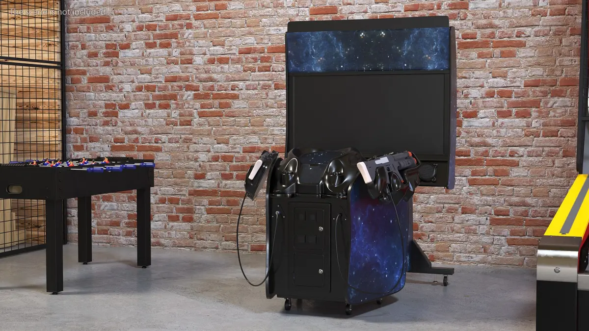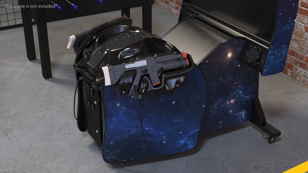 Space Arcade Game Machine Off State Rigged for Cinema 4D is a 3D model of popular apparatus for science fiction style Arcade shooting game which immerses players in a science fiction (sci-fi) style battle against extraterrestrial invaders.