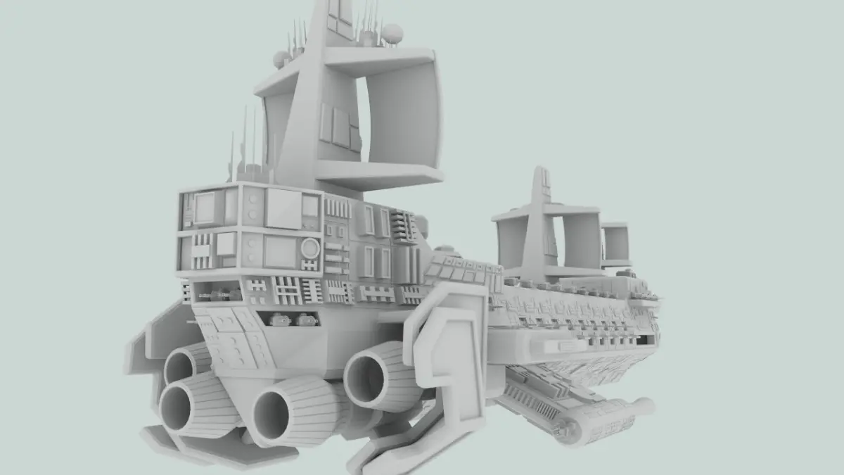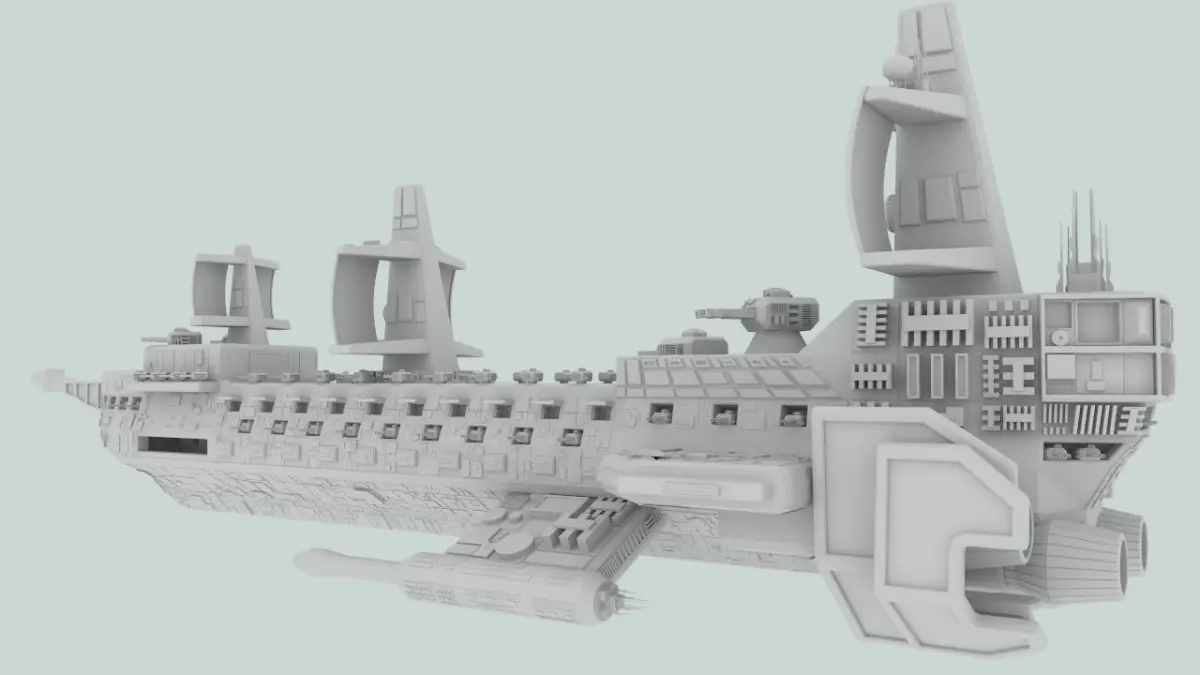 Main gun turrets and space fighter hatches are in separate layers with pivot points placed to facilitate rotation/opening/animation. In lIghtwave, hatches can also be opened with morphs one morph for upper hatches, one for lower.