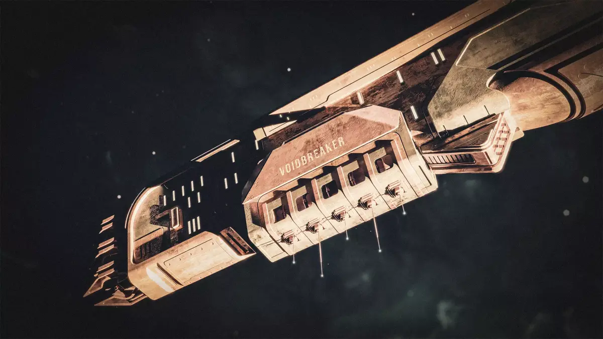 The Voidbreaker's design features a heavily armored hull, numerous weapon emplacements, a commanding bridge structure, and massive engine blocks.