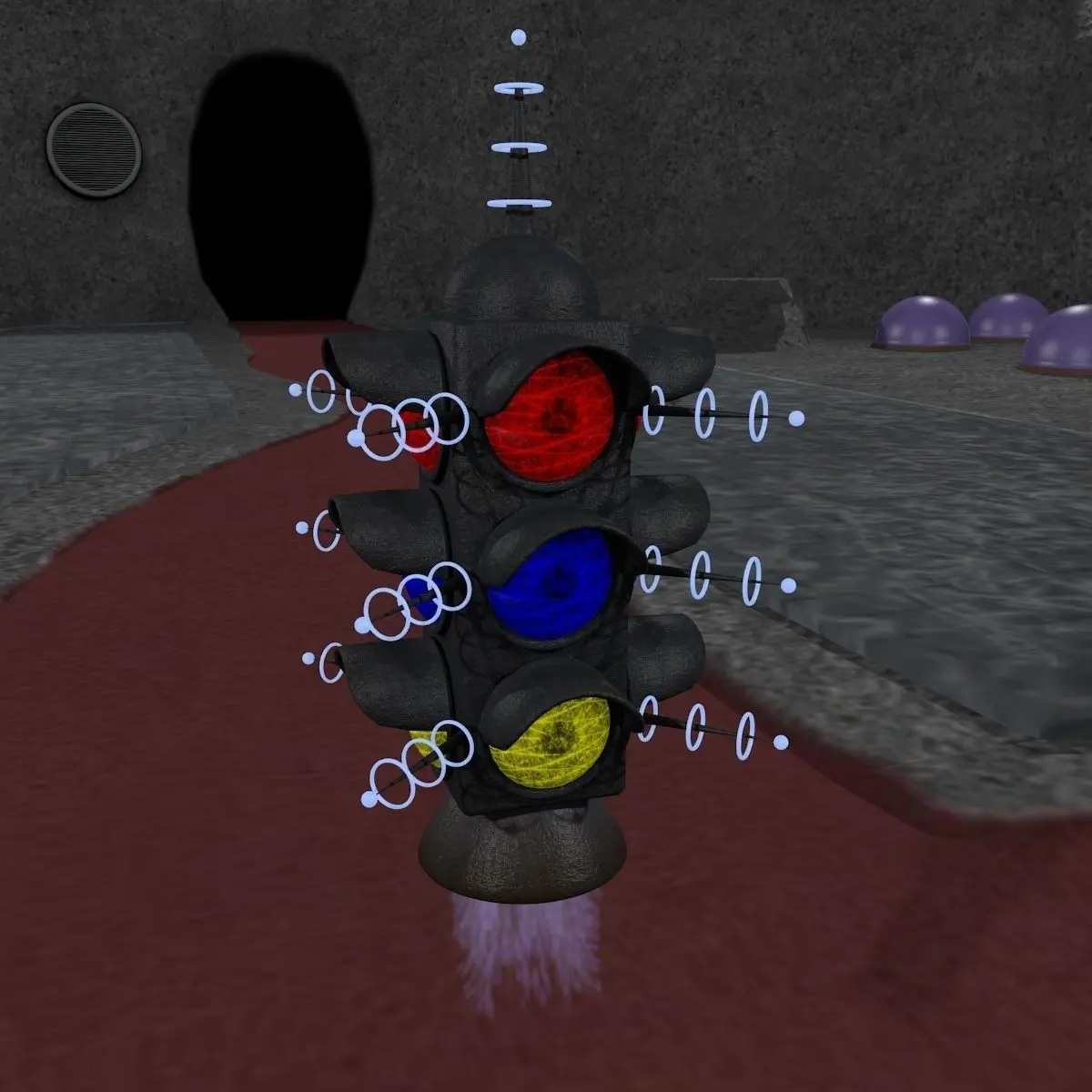 The scene shows a extraterrestrial little city in the crater of a dusty planet.At the center of that city, a traffic light flies on the crossing. The four roads go out from crater, passig through tunnels.It is possible to think that more cities can be connected by street in this way.Little houses are built on the surface (the little violet globes on the surface).In the city there is only one skyscraper. Front of it, there is a fenced parking. If you pay attention to the position of the white signs on the floor, it is possible to understand that the vehicles of this civilization can fly.On top of the parking, there is a kind of counter flying screen that show the number of free and occupied places. The language is not comprehensible.Some part of the energy used in the city comes from a thermal power station. It takes advantage of the subsoil heat of the planet.The light is provided by four big spotlights on the four top sides of the crater.**