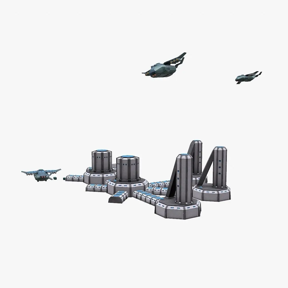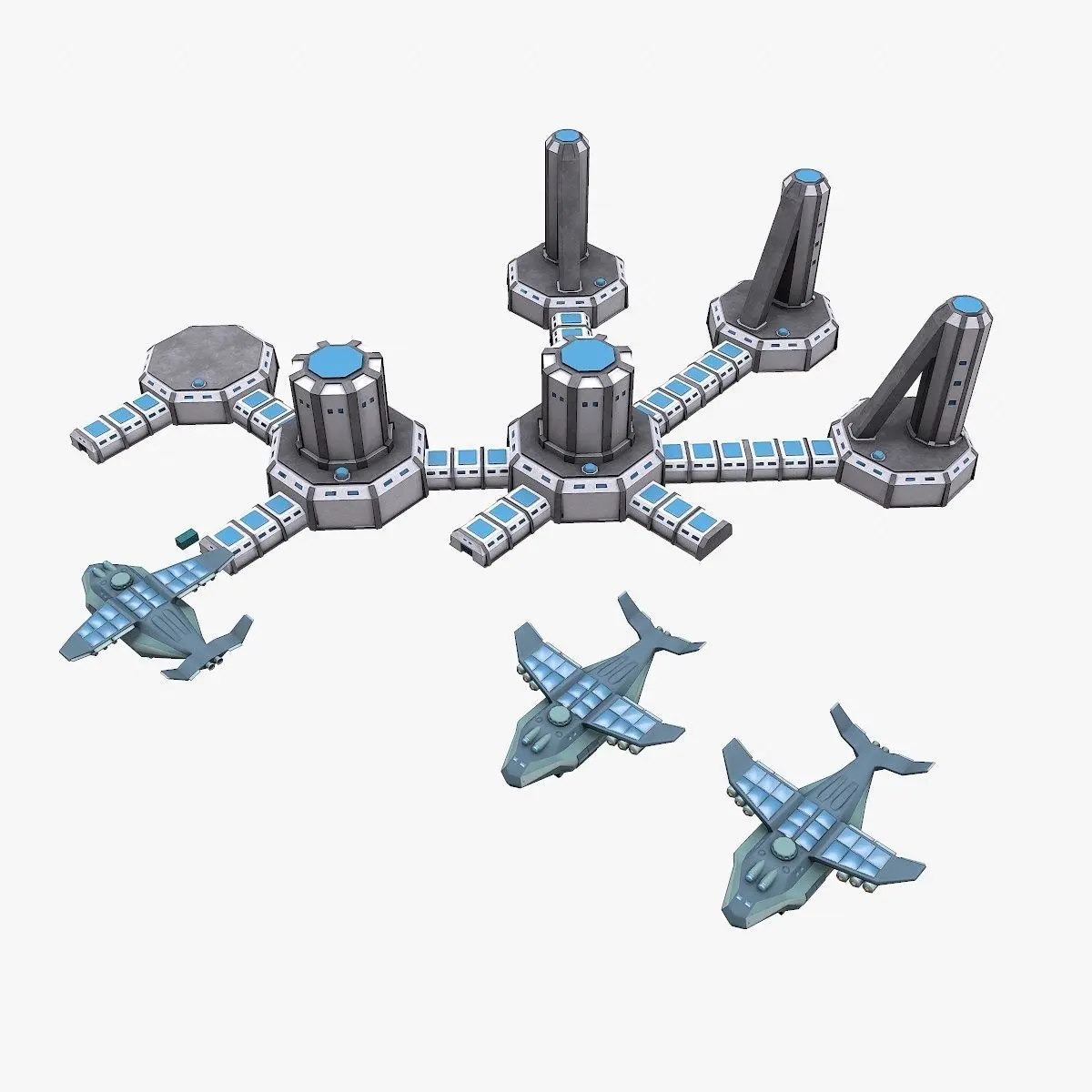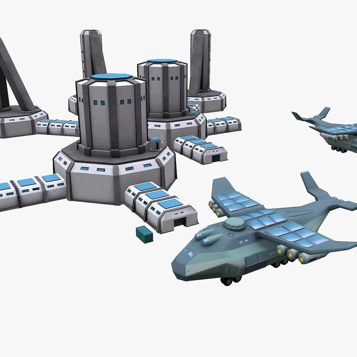 Space Factory and Cargo Spaceship.Low poly model, game-ready. 1.Space Factory.Sci-fi plant, mining plant, mines.Total polys 7227 and total verts 7552.The factory is made up of modules, 10 objects separately are modules. They have a total of 2189 polys and 2372 verts.PBR-texture 2048x2048: Base Color plus AO, Base Color, Metallic, Normals, Ambient Occlusion, Roughness. One texture for all objects.2.Cargo Spaceship.Transport.Total polys 1925 and total verts 1955.PBR-textures 2048x2048: Base Color, Base Color plus AO, Normals, Ambient Occlusion, Metallic, Roughness, Emissive.8 separate objects. One texture for all objects.3.Container.Total polys 12, total verts 8.PBR-textures 2048x2048: Base Color, Base Color plus AO, Normals, Ambient Occlusion, Metallic, Roughness, Emissive.