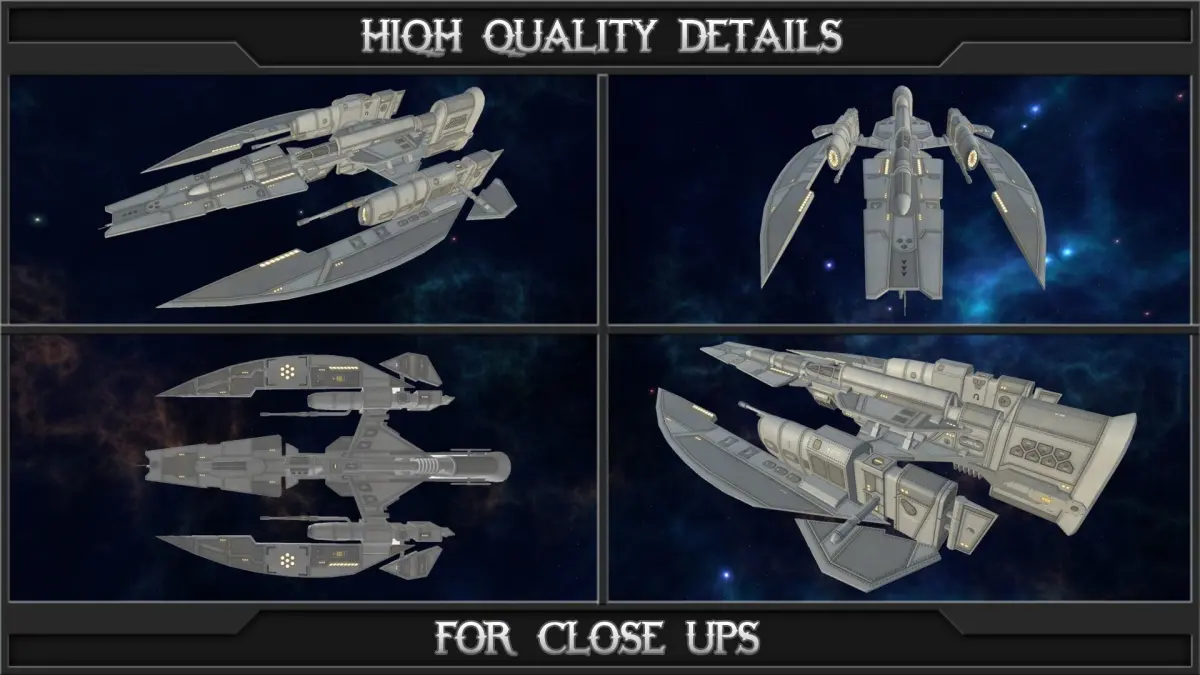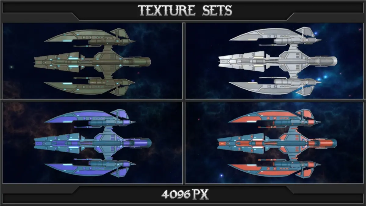 - Texture Variation: 8 pre-made HD (4k resolution) texture sets. Each set contain specific color scheme: Set 1: Navy, Set 2: Empire, Set 3: Technocracy, Set 4: Monarchy, Set 5: Corporate, Set 6: Pirate, Set 7: Shadow, Set 8: Lunar.