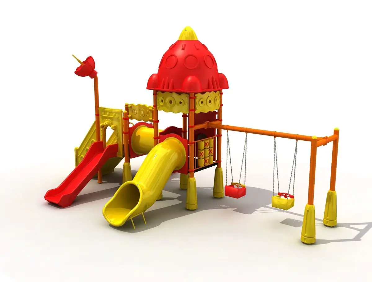 This is a metal 3d playground space concept. include in flat Slide , tube slide , spaceship roof and stairs, polythene barrier, special polythene parts, spaceship park concept, oxo panel, swing, mountainer climber .