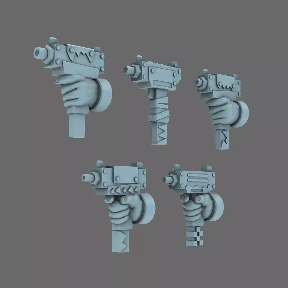 Check out our Space Orcs Uzi Style Pistols. These feature chunky, high-contrast 3D details that make painting a breeze. The product comes with two left-handed versions, two right-handed versions, and one without a hand. Perfect for any 28mm tabletop army of space-faring orcs, marauding greenskins, and other war-clan brutes ready to rumble across the stars.