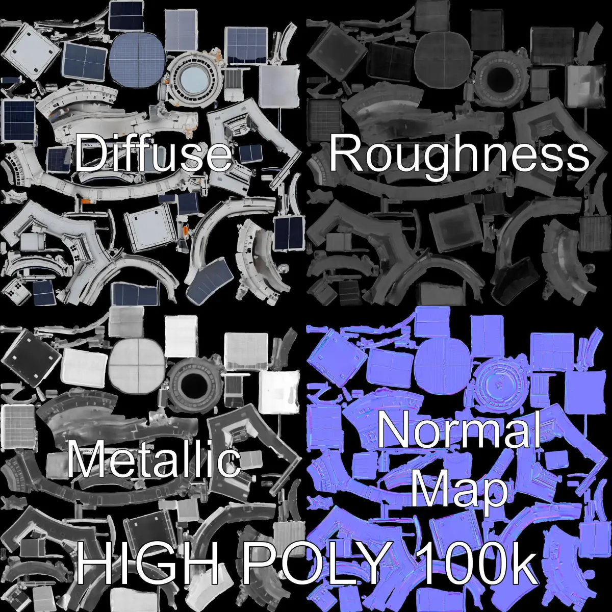 This Space Satellite Module 3D model pack offers three levels of detail, making it suitable for various applications, including production rendering in software like 3ds Max, Maya, and Blender, as well as in game engines such as Unity and Unreal. The model comes with PBR textures and includes Diffuse, NormalMap, and reflection/roughness/metallic maps, all at 4096x4096 resolution. The UV mapping is precise with no overlapping. Ideal for use in educational simulations, sci-fi movies, or interactive presentations.