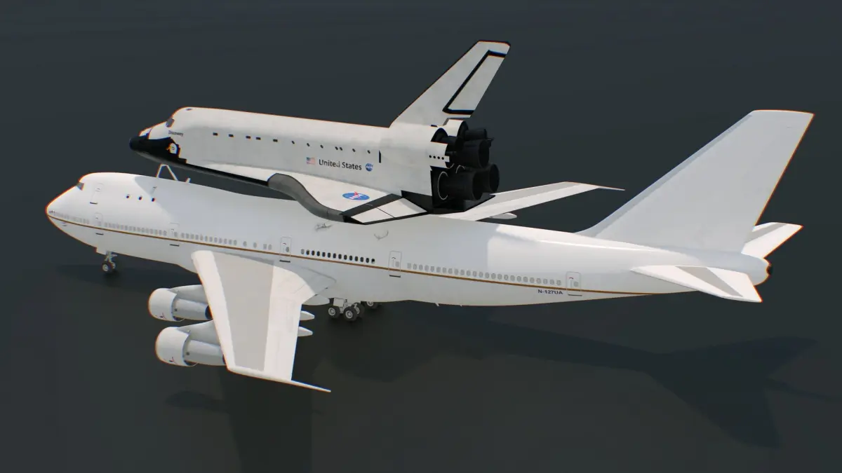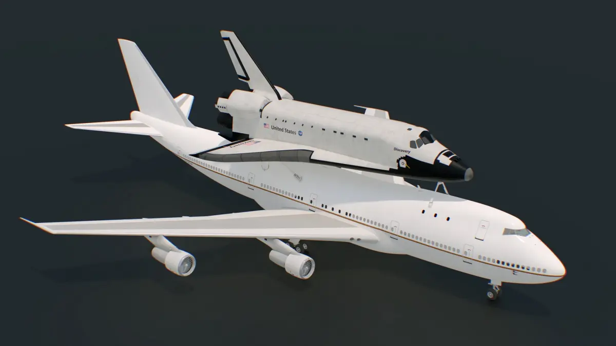 Space Shuttle on Connection Frame and Carrier Aircraft is a 3d model of assembly of a Space Shuttle orbiter securely mounted atop a modified Boeing 747, known as the Shuttle Carrier Aircraft (SCA), using a specialized structural framework called the Connection Frame.