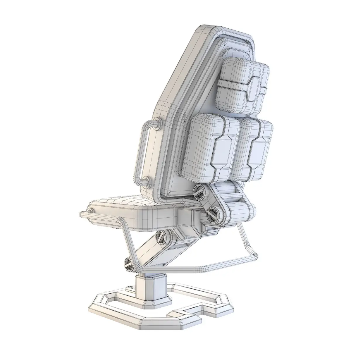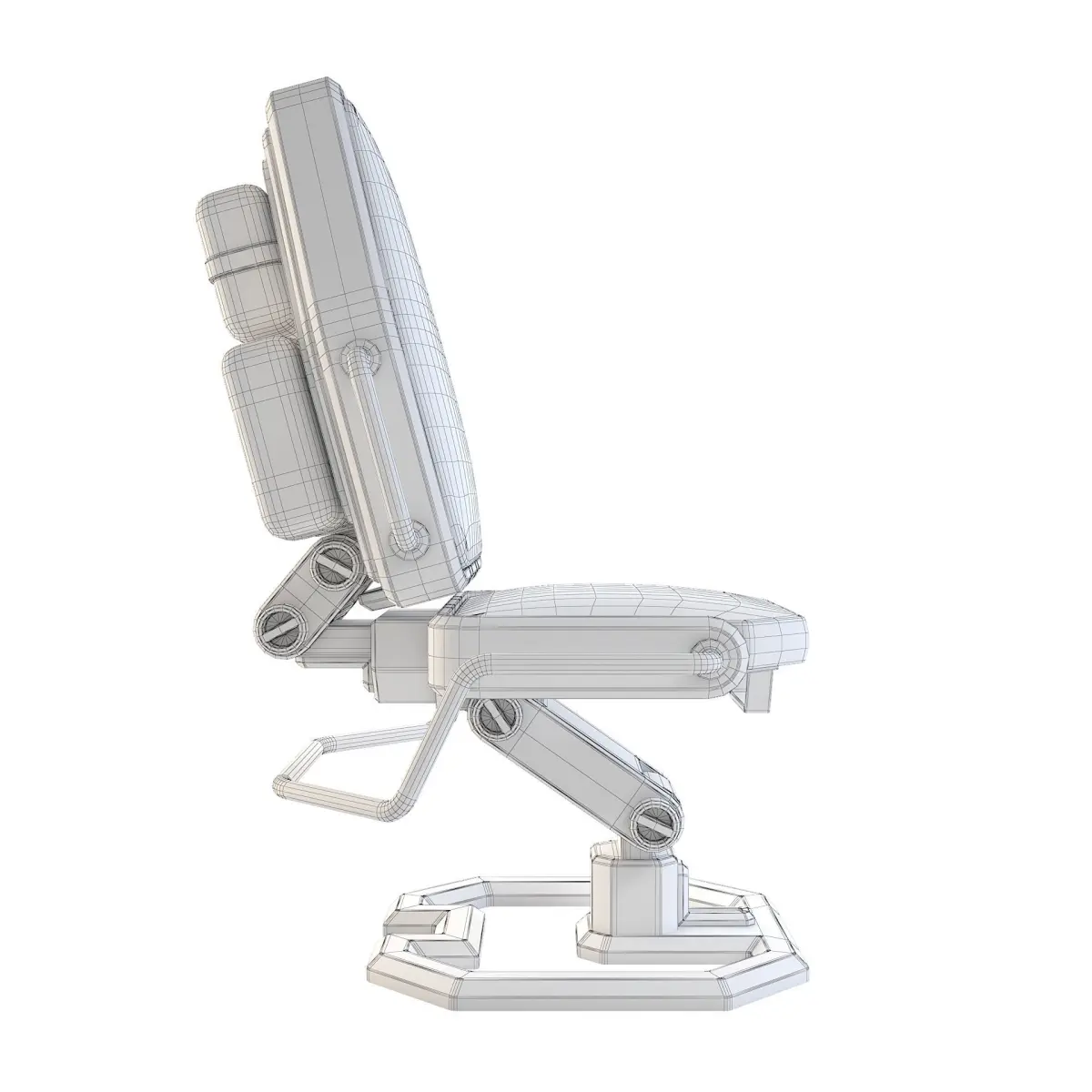 Metal space station chair with red leather seating.