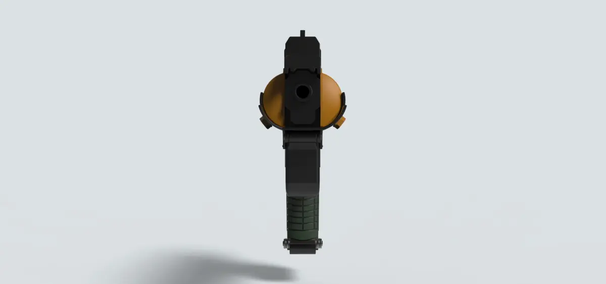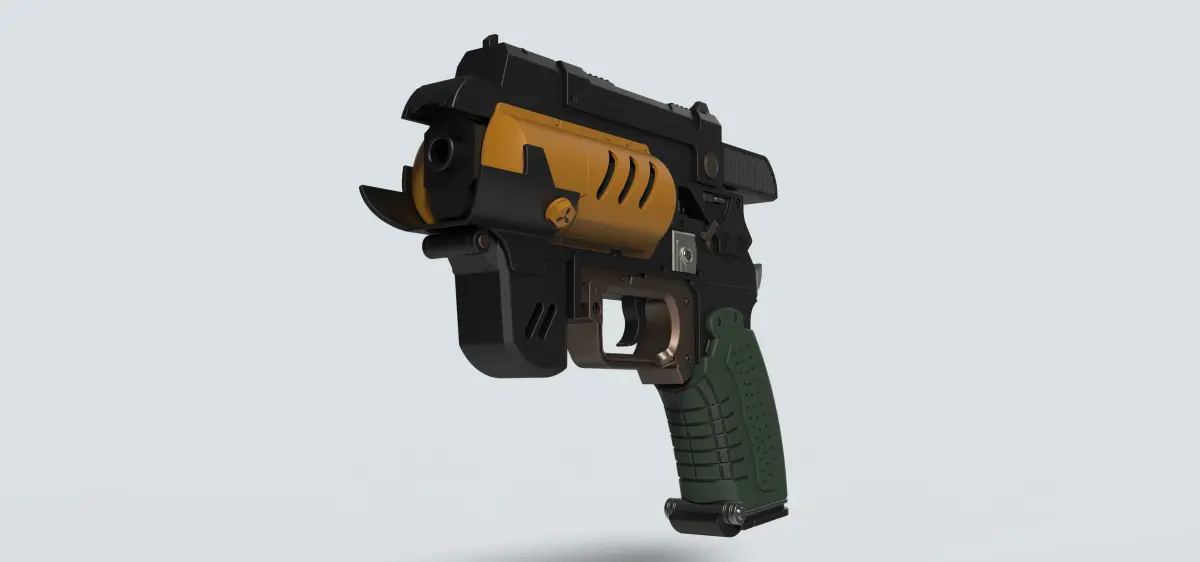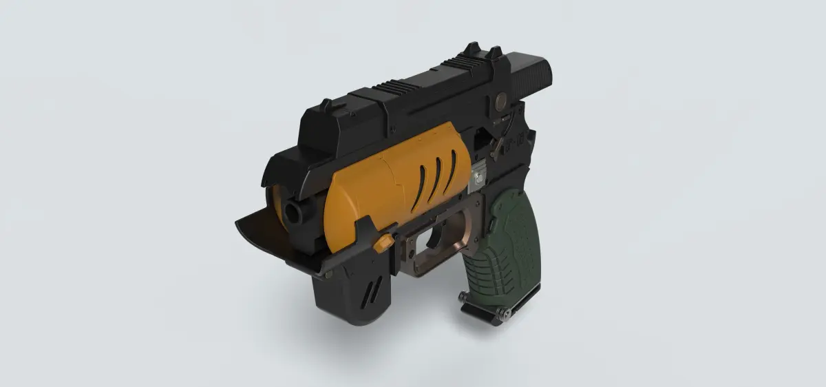 Model consists of parts: barrel, body, handle, rear insert, rear part, side buttons, side inserts, side lever, side screws, square insert, trigger.