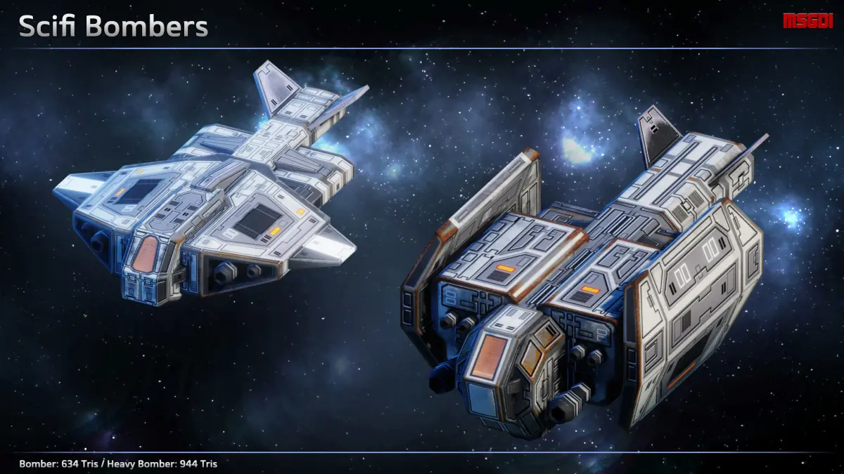 This pack contains a complete fleet of fighters, bombers, scouts and carriers, ready to reinforce your fleet. They can be used in space RTS games, in a sidescroller or in a top-down shoot’em up.