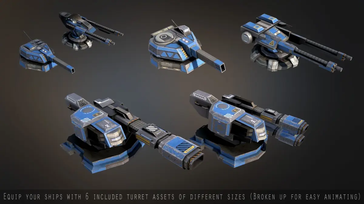 All assets use include a Substance Material and multiple texture sets. Also contains 4 turret assets and 4 engine assets to further customize the ship.