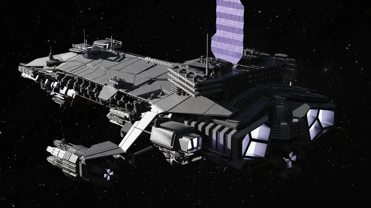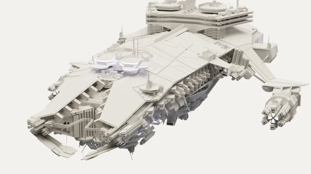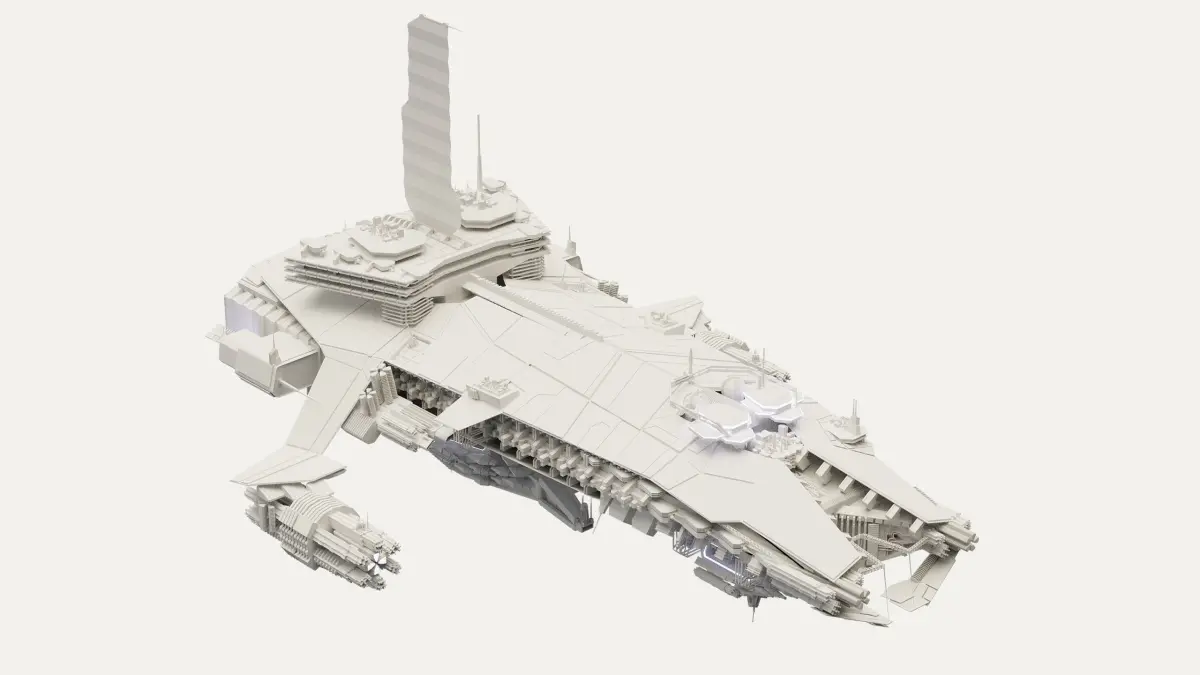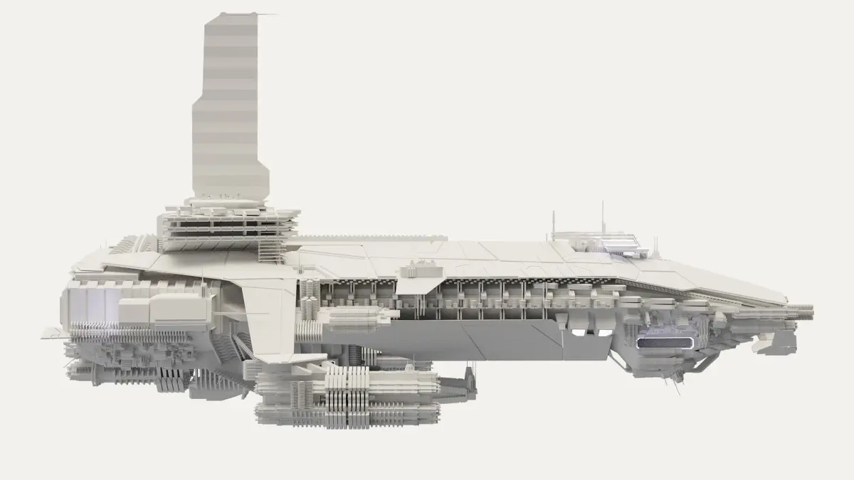 High detail spaceship model, purely fictional, not based on existing intellectual property. Modelled in Blender 2.9, no textures included, blendfile contains basic cycles/eevee materials. Hull, details, solarpanel, engines and emissives are separate parts. Contains 665,708 Vertices and 634,627 Faces, Ngons, overlapping UVs. Available as blend, OBJ and FBX file.