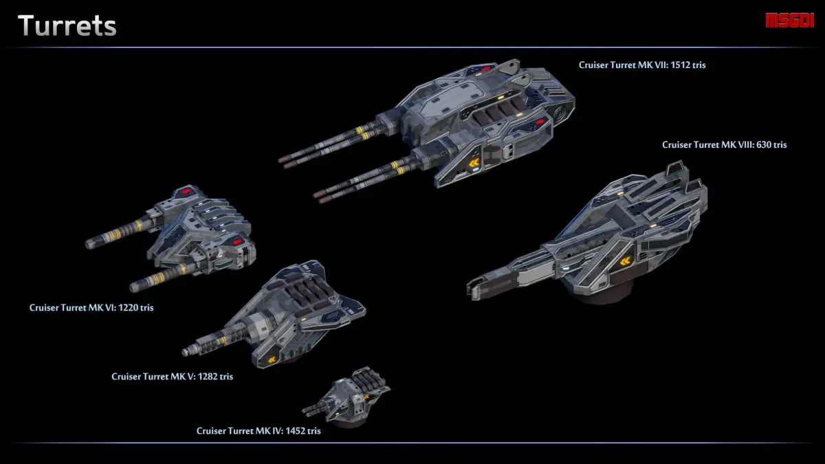 - Turrets, cargo module, hangar, gun batteries and missile silos