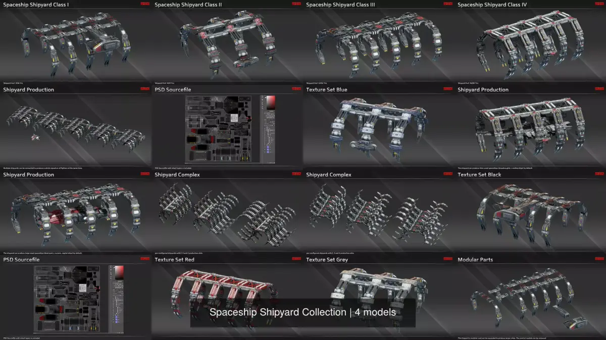 This collection contains a 4 shipyards of different sizes. They can produce all classes of spaceships from fighters to dreadnoughts. They can be used in a space themed game.