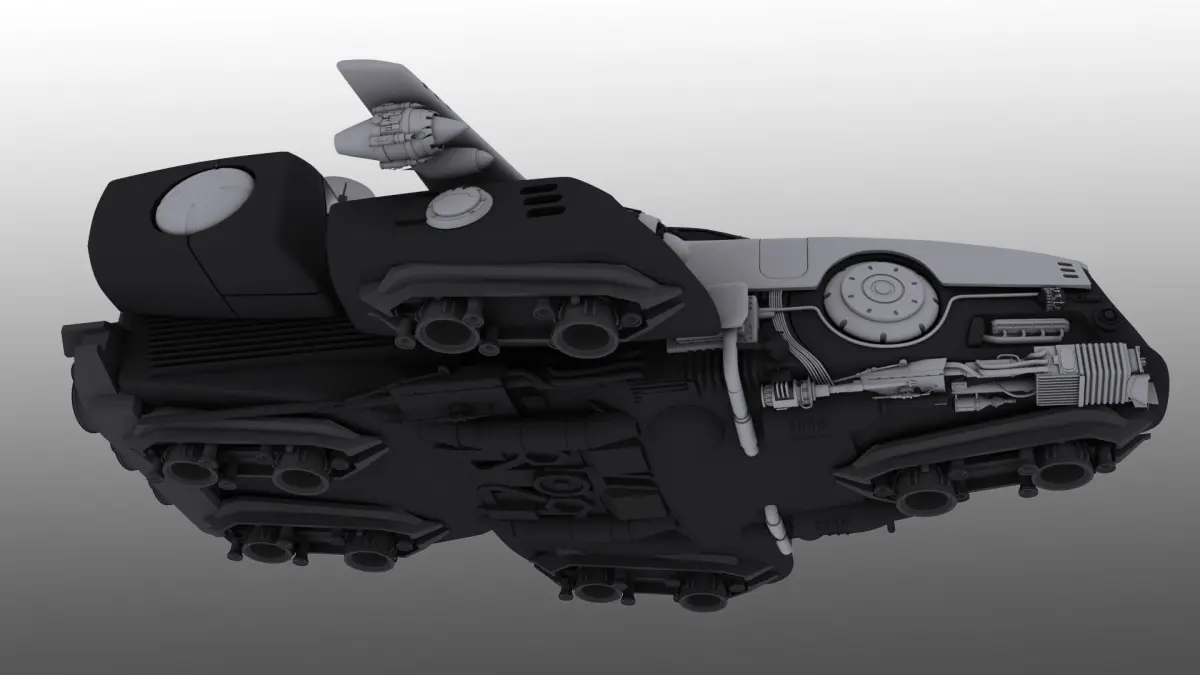 Spaceship model + interior. Made by using kitbash models. No textures but partly UV-mapped (see the picture). Rendered by default scanline render.