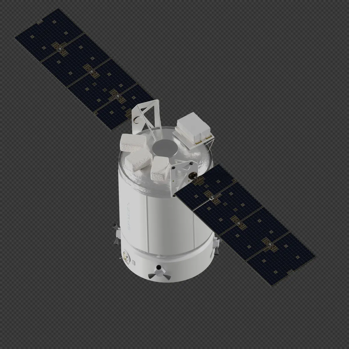 All materials, textures, and linked libraries are packed in the .blend file. Unapplied modifiers and instancing have been used to reduce file size and enable easy editing. Solar arrays are articulated