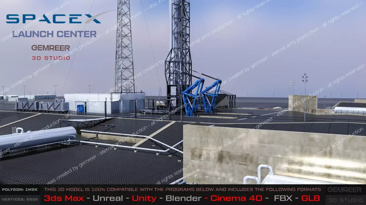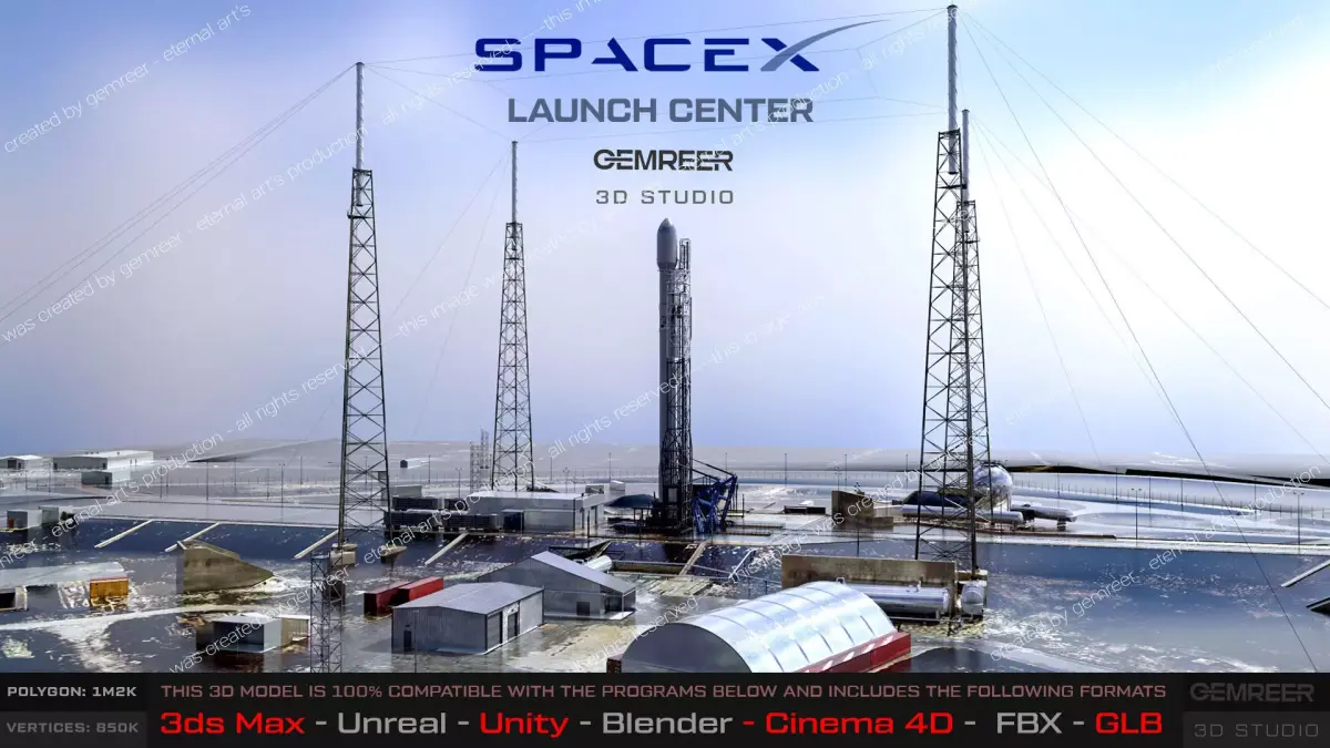 Comprehensive Asset Pack: Includes rocket platform, lightning arrester towers, hangars, and containers.