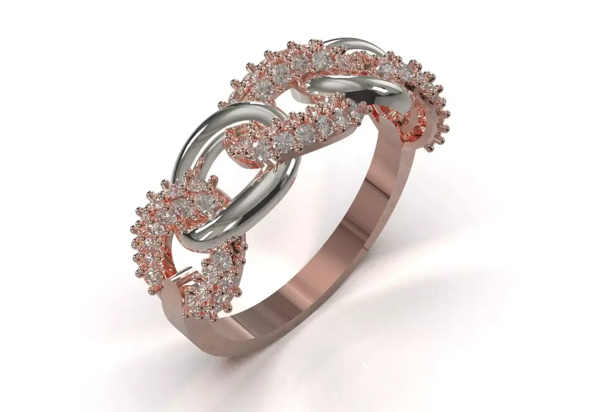 | Feature | Technical Description || :--- | :--- || Product Type | Cocktail Ring/Chain/Statement Ring || Product Code | JR00325 || Motif Design | Large, interconnected chain rings that cover a large width of the finger. || Gem Cutting | Round Brilliant gems in a small size. || Setting | Pavé to cover parts of the rings. || Metal Structure | Two-Tone: Combination of white gold (for the rendered pavé parts) and rose gold (for the plain parts) to create depth. || Dominant Style | Modern, cocktail, voluminous and strong. |