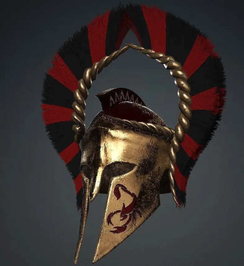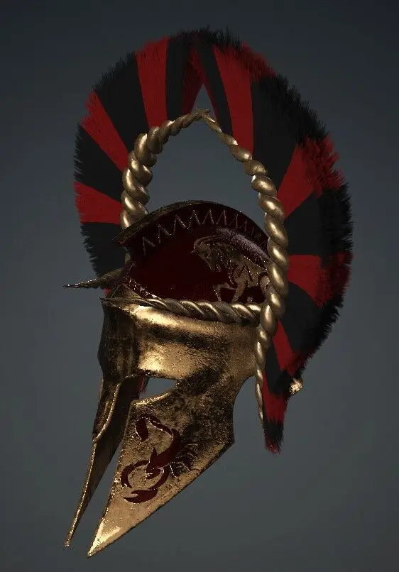 This Horned Scorpion Spartan Helmet is a premium-quality 3D model, meticulously designed for games, cinematics, and historical/fantasy projects. Combining ancient Greek warrior aesthetics with a mythological twist, this helmet features a golden battle-worn finish, engraved scorpion details, and twisted bronze horns, creating a truly fearsome and regal warrior look.