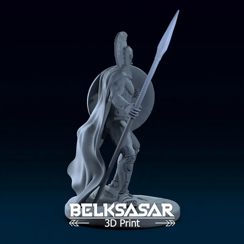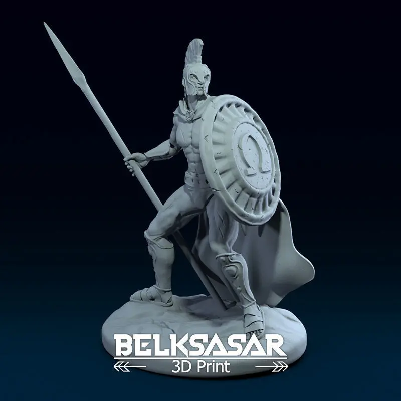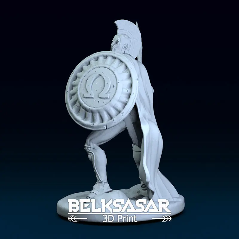 Spartan warrior in dynamic pose on rocky ground, scaled to 15 cm, can be printed larger.