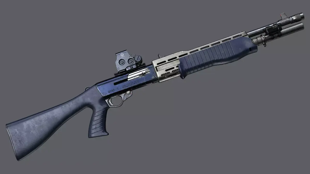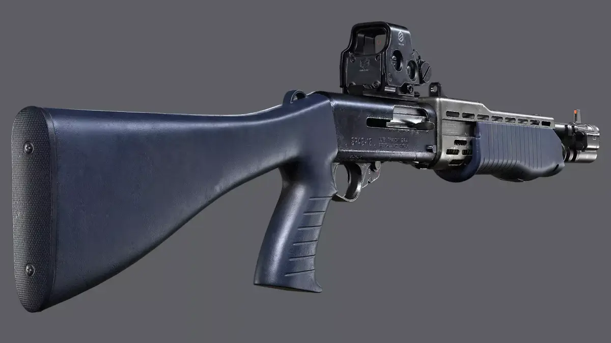 Game ready mesh and textures for legendary Franchi SPAS-12 with classic Plastic Stock, Holographic Sight, Picatiny Rail, Barrel Clamp and Flashlight.