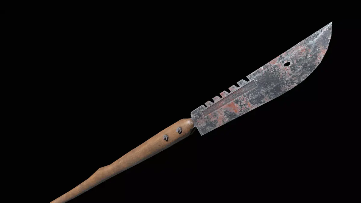 This improvised blade is designed to look like the kind of tool or weapon assembled in a workshop, a barn, or a makeshift crafting space—something created out of necessity rather than manufactured with precision. The blade carries uneven surface wear, patches of rust, and a roughened texture that suggests it has seen harsh use and poor storage. The jagged spine and the hole near the tip reinforce the idea that this blade was never intended for elegance. It is a repurposed piece of metal, cut down, reshaped, and bolted into service.