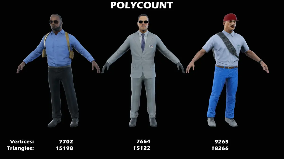 Vertex/Tris counts of characters: Minimum modules: 7702 / 15198, Maximum: 9640 / 18904