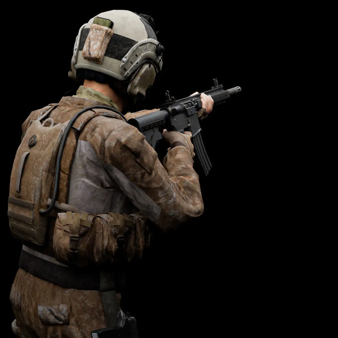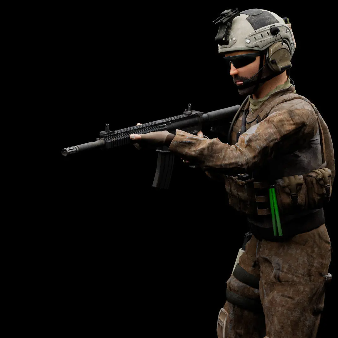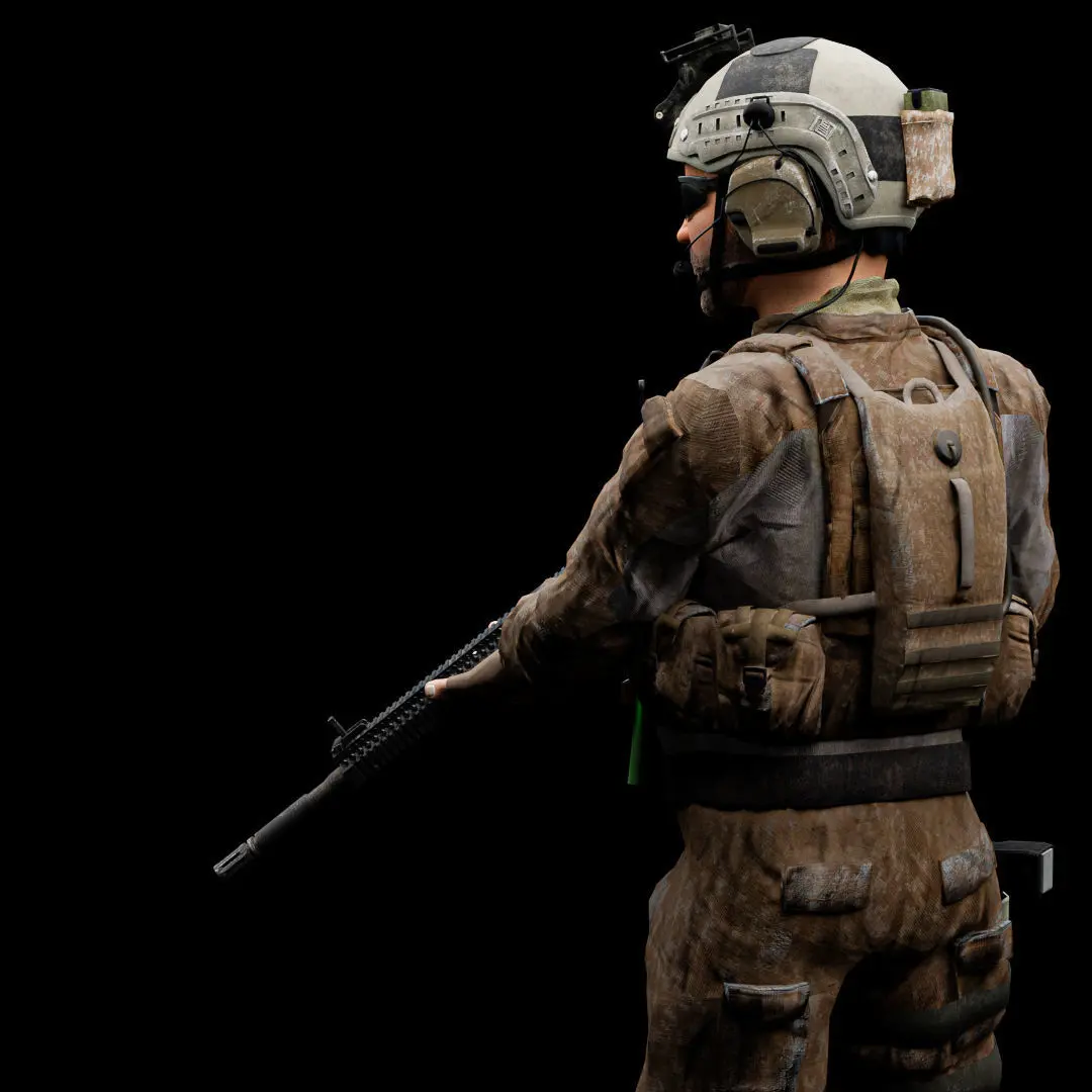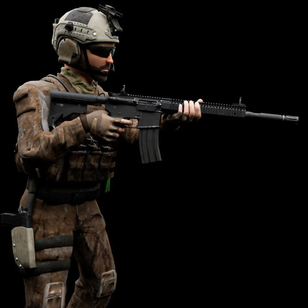 Game-ready and VFX ready 3D Special Operation US soldier model that includes 2K and 4K PBR materials fully rigged with custom bones and shape keys and also includes two weapons.