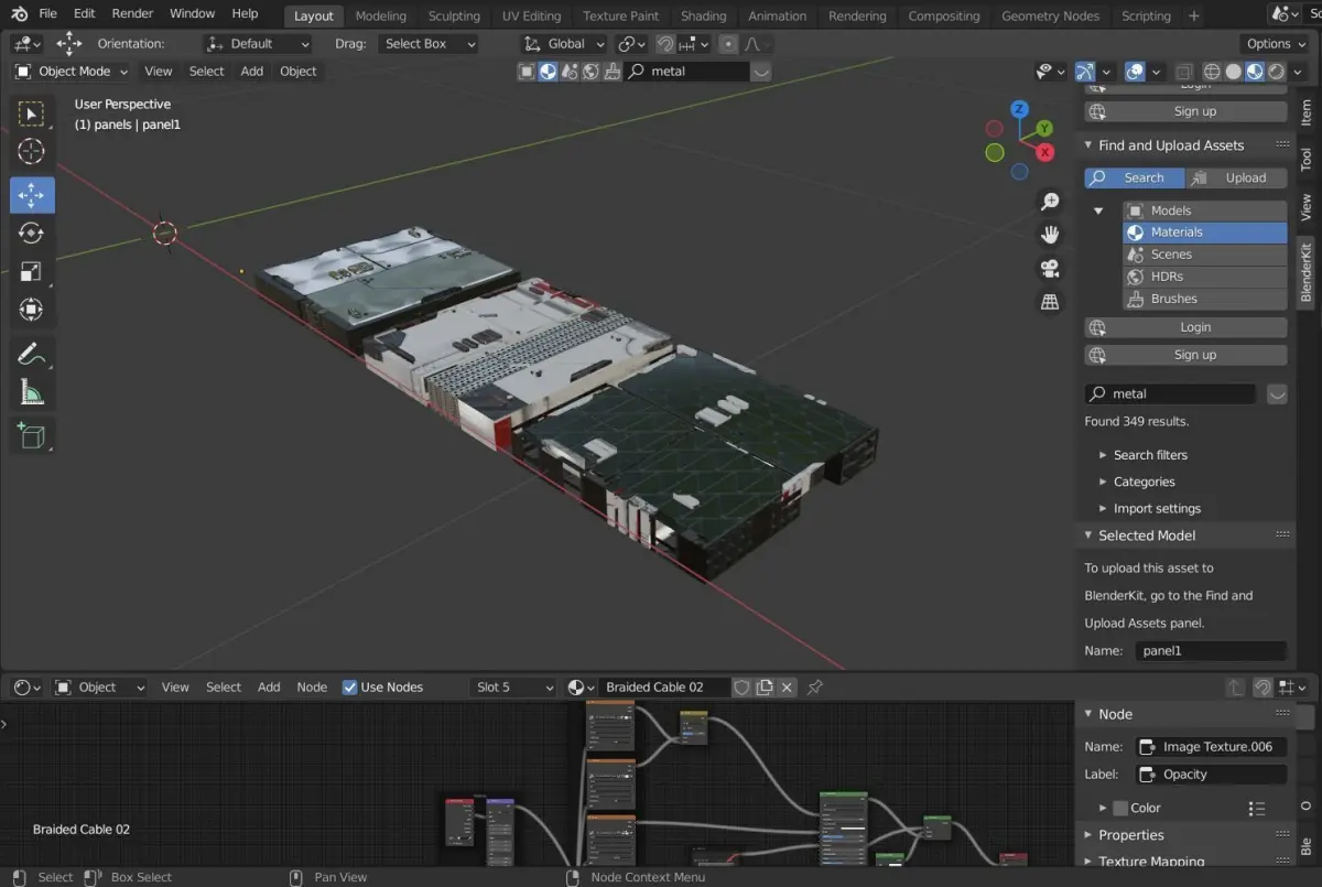The Blender file contains 23 objects (high poly pieces and low poly versions). The first panel that I comosed as example (it is royalty free also for commercial use) is 2646 verts x 760 faces. Uv mapping: non-overlapping. Materials included (material groups, 15 material assets with textures). Available in different format. Blender native. SVG paths are included, you can edit with the panels with no limits! Royalty free also for commercial use.