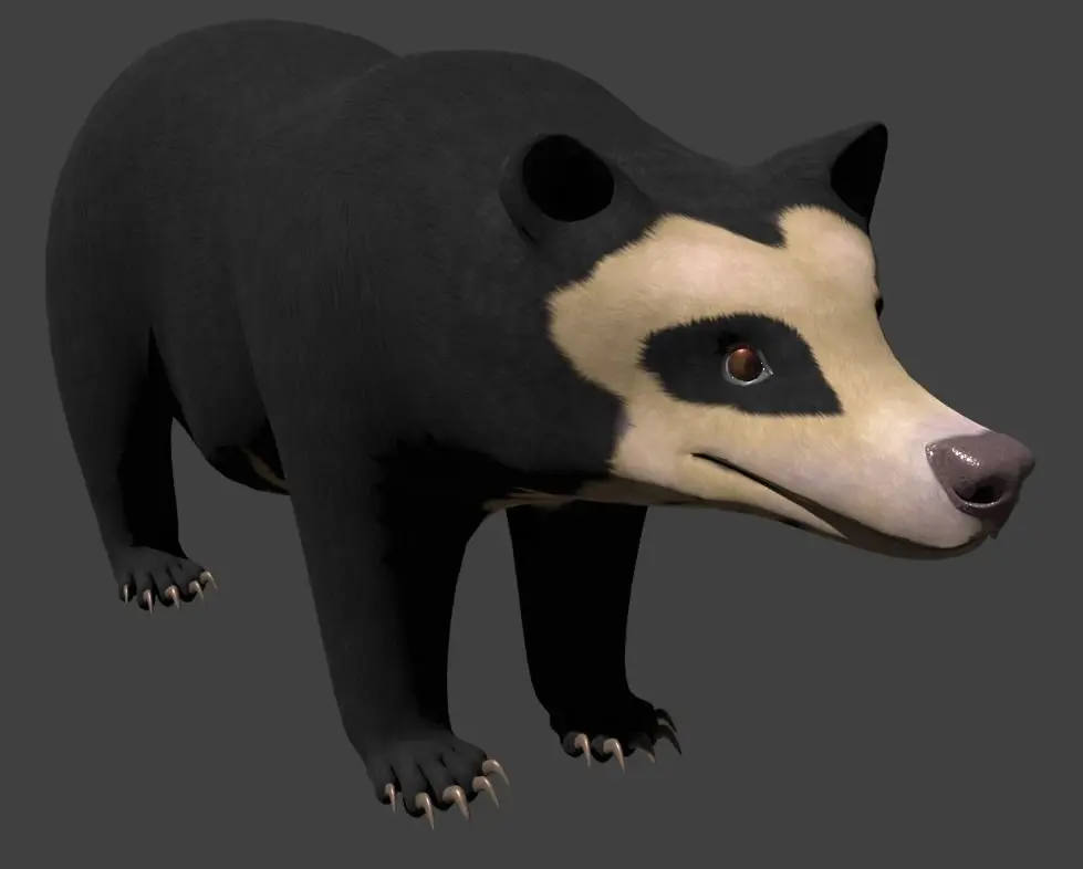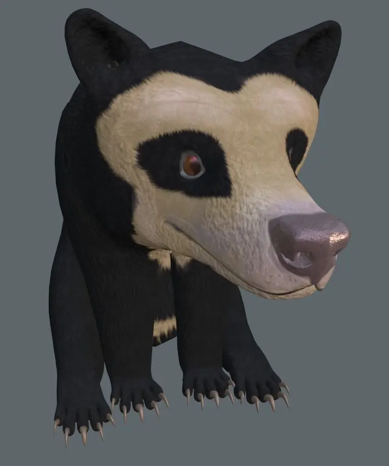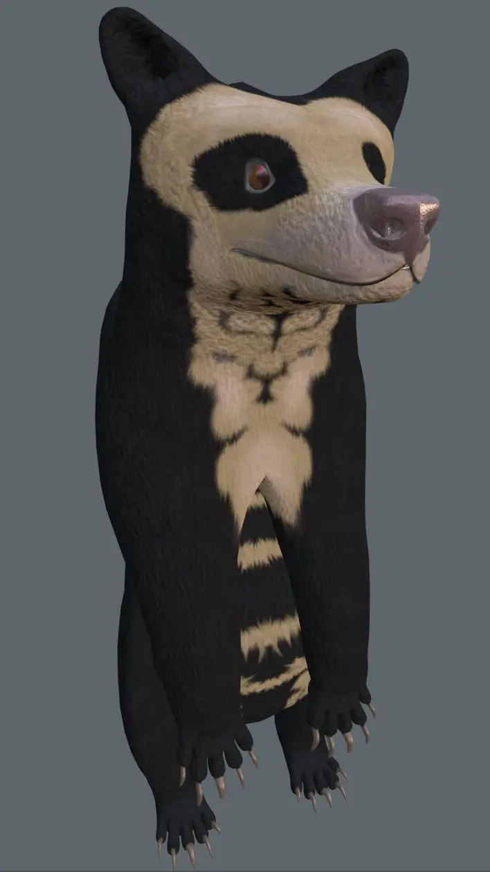 This is my model of a Spectacled Bear native to South America with 21 animations and poses. The modeling, rigging and animating were done with Blender. The textures and materials were created using Blender and the graphics editor Paint . net. The textures are 4096x4096 and 1024x1024.