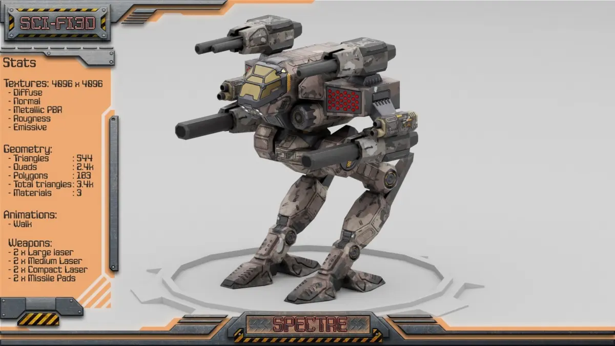 Spectre is one of battle mech project which contains various mechs and individual weapon sets. It is designed as Low-Poly for mobile games.
