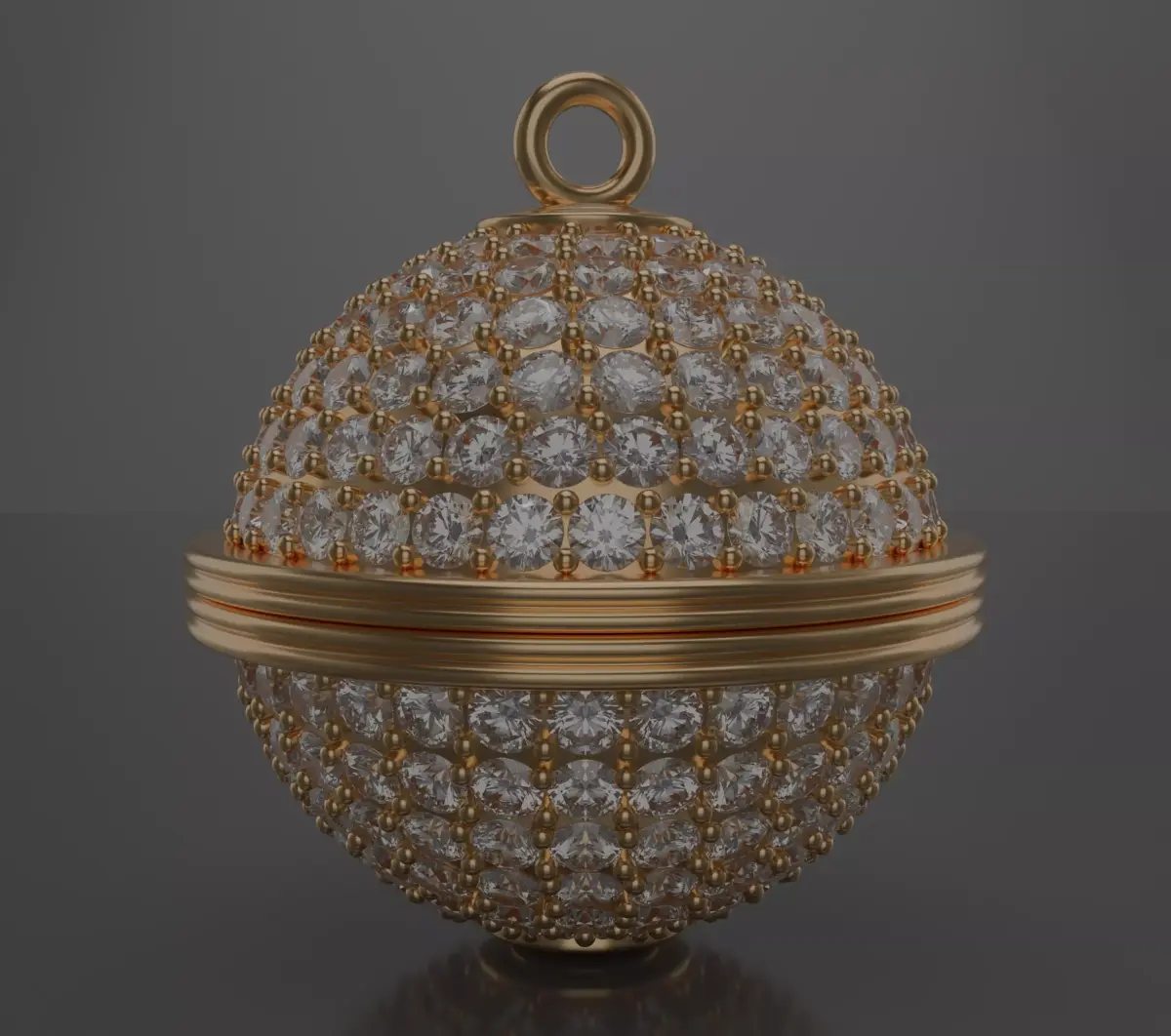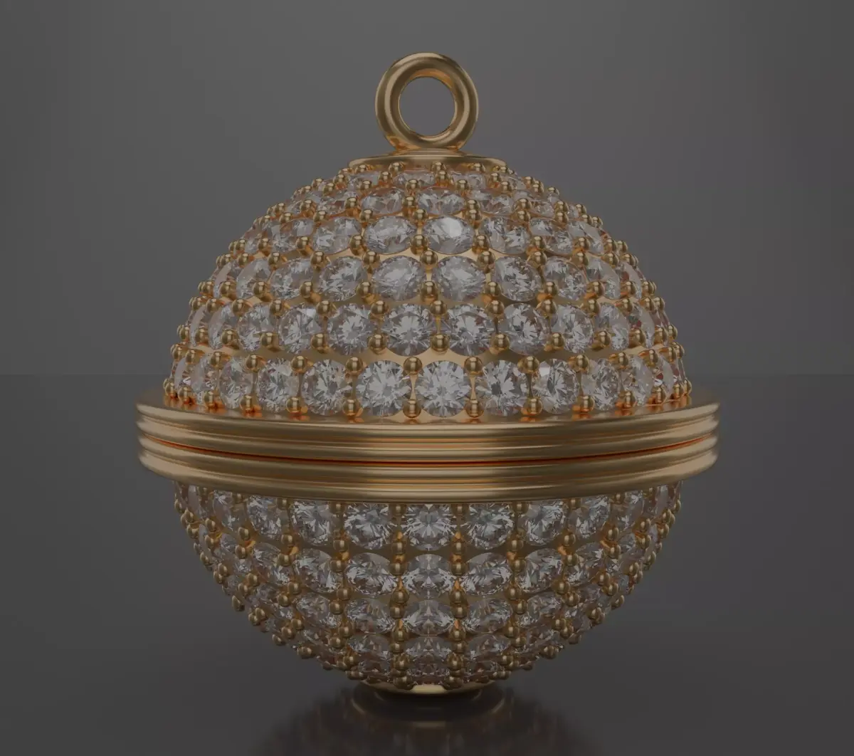 What makes this design truly stand out is its functional, detachable structure. The pendant is made of two perfectly matched hemispheres, connected by an elegant decorative band. These halves can be “unscrewed” or separated, revealing the inner space — a detail that brings extra authenticity and versatility for use in various 3D visualizations.