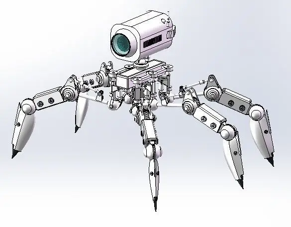 The spider-like investigative robot can move freely in complex terrain areas and is suitable for security inspections, border patrols and other occasions. The model is made by SolidWorks, with a complete three-dimensional drawing of parts, three-dimensional assembly drawings, complete parts, editable
