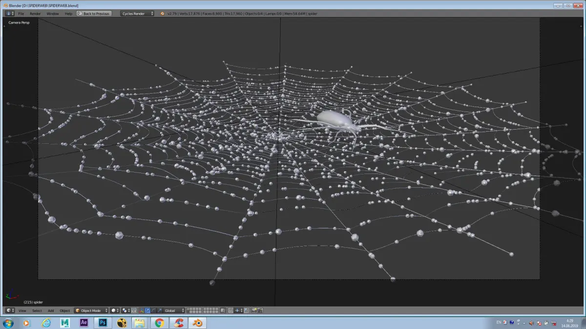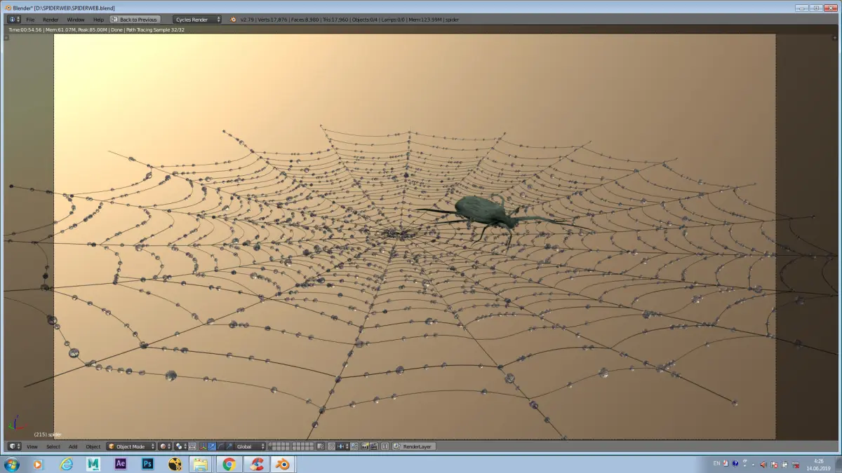 This is animated dynamic spiderweb with water droplets and the spider. Zip file contains blend.file. Mesh deform modifier is attached to the Spiderweb mesh and Cloth modifier is attached to another hidden mesh that is called Deformator so this Deformator bending the spiderweb. Simply press play button, grab the locator (spiderweb and deformator parented to the locator) and position spiderweb to any place of your own scene. Remember always press the play button before you want to move the locator.