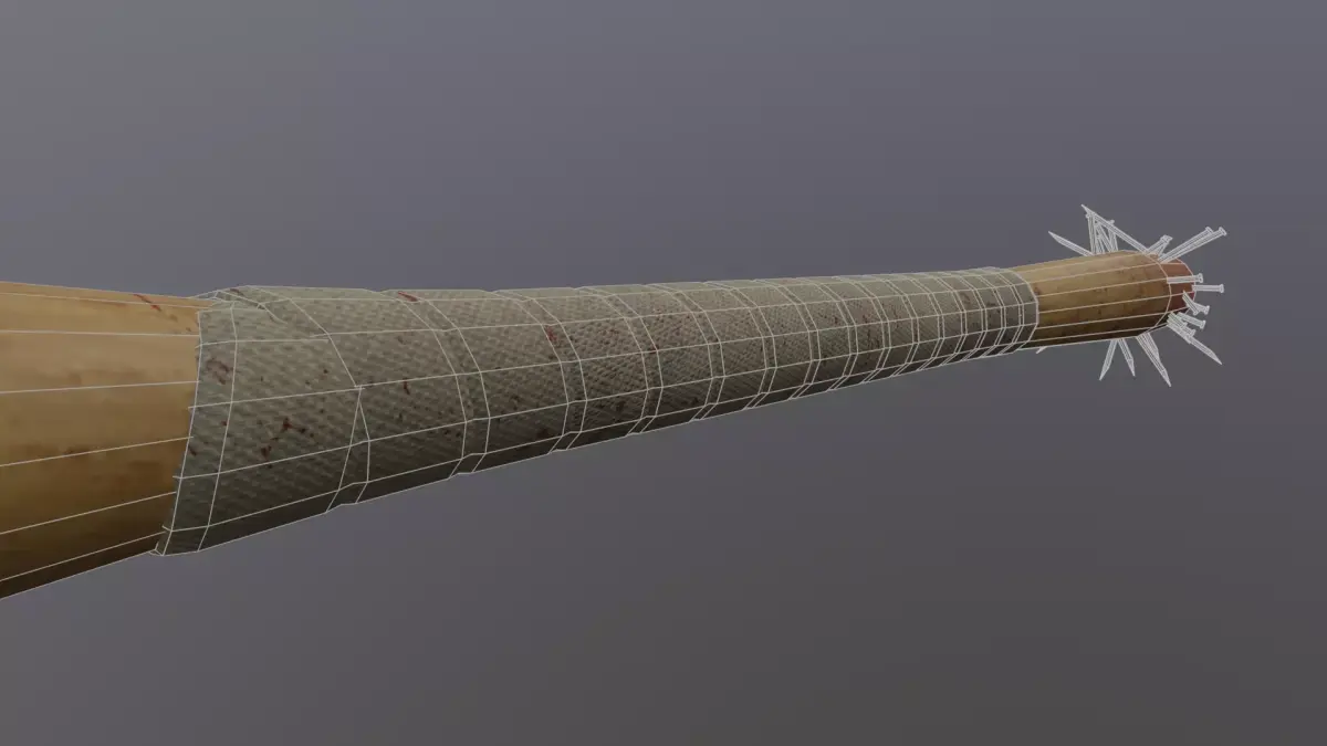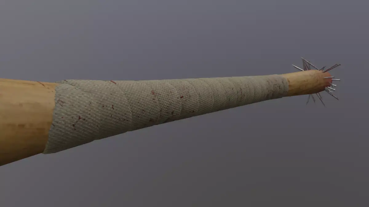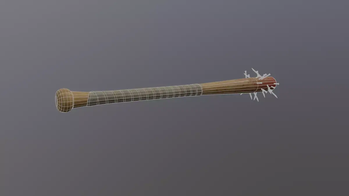 - Game-ready spiked baseball bat 3D model featuring a worn wooden bat reinforced with embedded metal nails and spikes. The asset has a gritty, violent aesthetic suitable for horror, survival, post-apocalyptic, or action-themed projects.