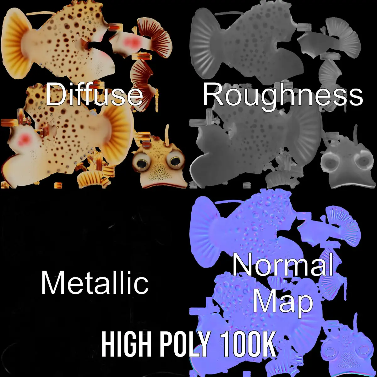 This spiky fish model pack offers three levels of detail - suitable for mobile, environment, and production rendering. Perfect for game developers, animators, and 3D artists, these models can be used in underwater scenes, fantasy settings, or educational tools. Each model is meticulously crafted with PBR textures, including Diffuse, NormalMap, and reflection/roughness/metallic, enhancing realism in any modern rendering engine. Textures are high-resolution at 4096x4096, ensuring crisp detail. The models are accurately unwrapped with no overlapping UVs for seamless application. The first image is the reference used for creating the 3D model. It is important to carefully evaluate the quality of the model by examining the preview images that display the topology and polygonal mesh. These previews (WIRE and WEB 3D Preview) clearly demonstrate how accurately the model matches the original reference and how well the geometry has been executed. If you like this model pack, please leave a like and a comment. Your feedback is greatly appreciated!
