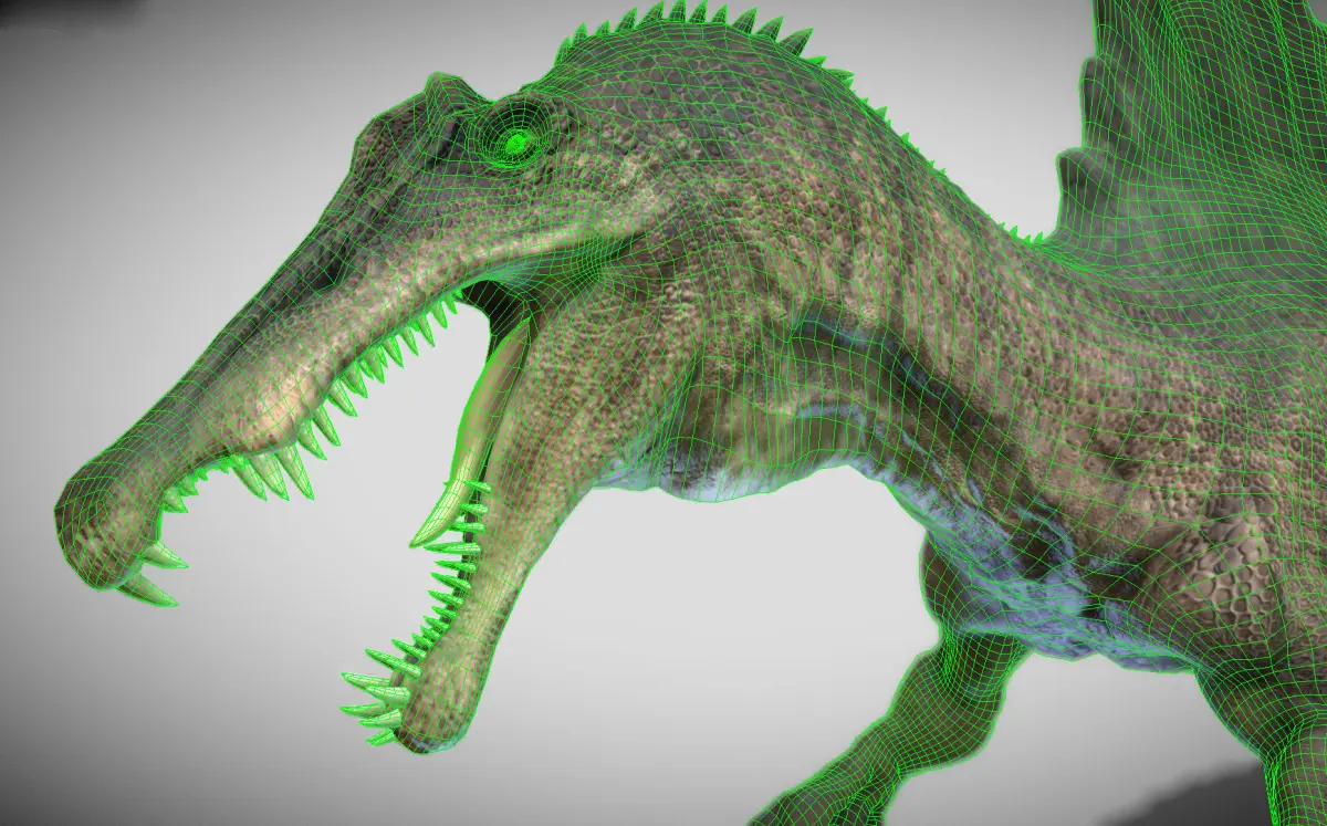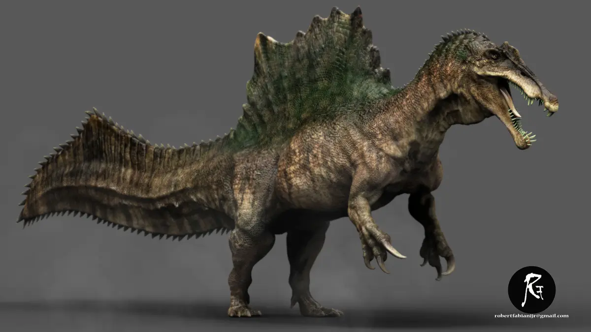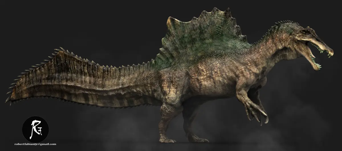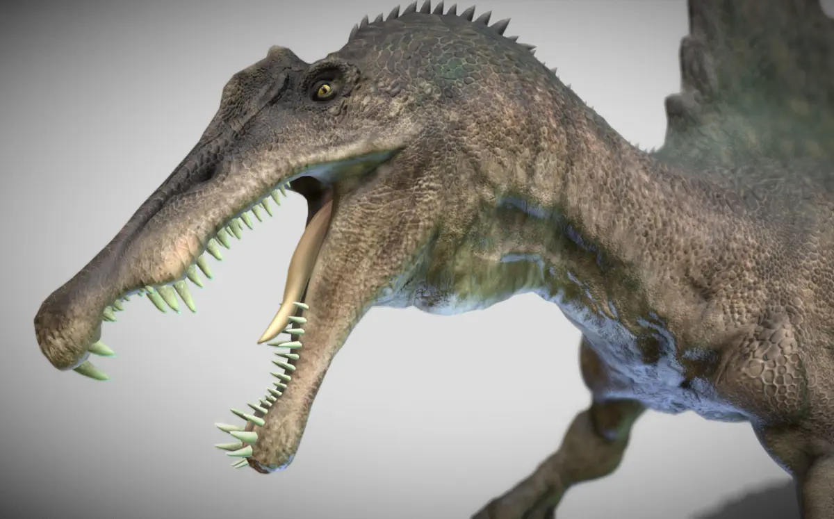 Spinosaurus was a colossal theropod dinosaur that lived during the Cretaceous period, approximately 112 to 93 million years ago. It is one of the largest carnivorous dinosaurs known, reaching lengths of up to 50 feet and weighing as much as 20 tons. Spinosaurus is renowned for its distinctive sail-like structure, formed by elongated neural spines on its back, which could have been used for display, thermoregulation, or storage of fat. Another unique feature of Spinosaurus was its crocodile-like skull, equipped with conical teeth well-suited for catching fish, indicating a semi-aquatic lifestyle. Its elongated, muscular forelimbs, equipped with large claws, suggest it was adept at catching and handling prey. Fossils of Spinosaurus have been found in North Africa, particularly in Egypt and Morocco, painting a picture of a versatile and formidable predator that thrived in both terrestrial and aquatic environments.