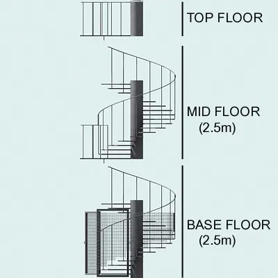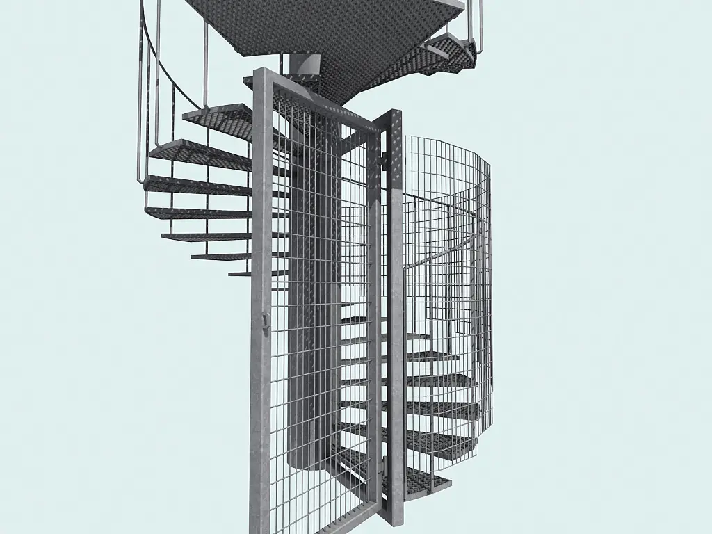 Spiral fire escape ladder made from galvanised steel. A lockable exit gate at bottom. Detailed model. The mesh is modular and consists of a base floor, a middle floor and a top floor. The median floor height is 2.5 meters, scale the ladder for your needs.