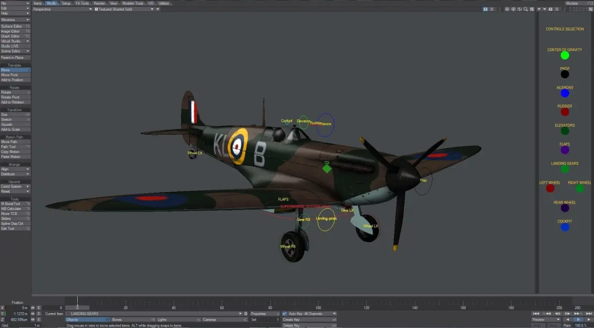 LIGHTWAVE The Lightwave scene includes a basic setup with controls that allows you to animate ailerons, flaps, rudder, elevators, landing gears, propeller and other stuffs. You can pick each item using the simple interface framed by the camera named 'Controls Selection Camera'. When you open the scene you will find this interface on the right side of the screen.