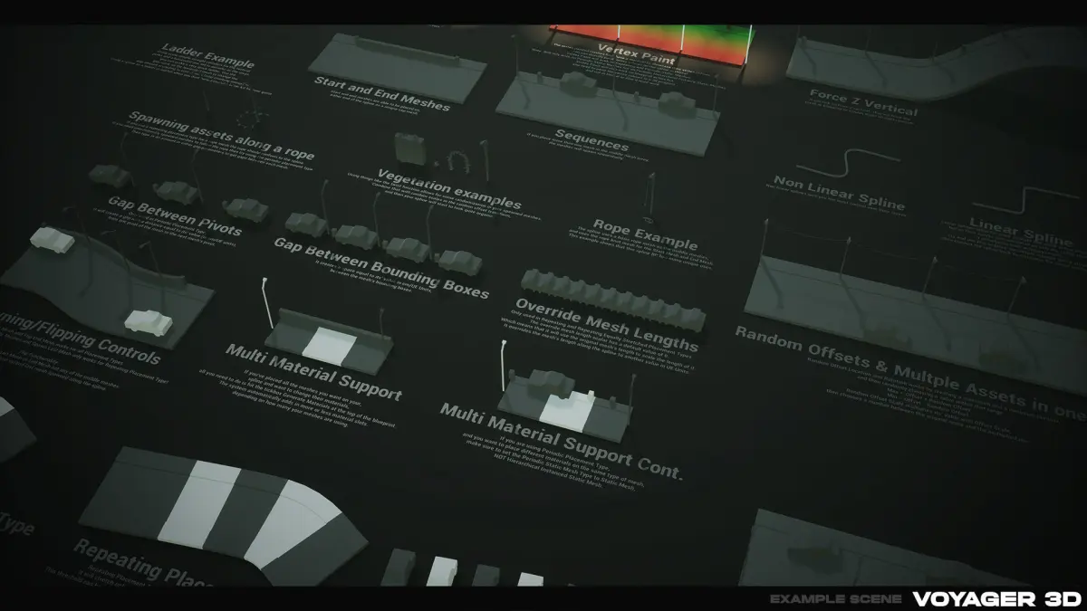 This pack comes with an example map and basic meshes to demonstrate Spline Plus' features.