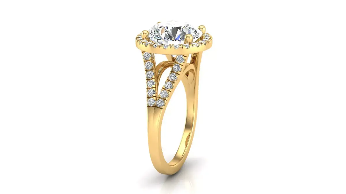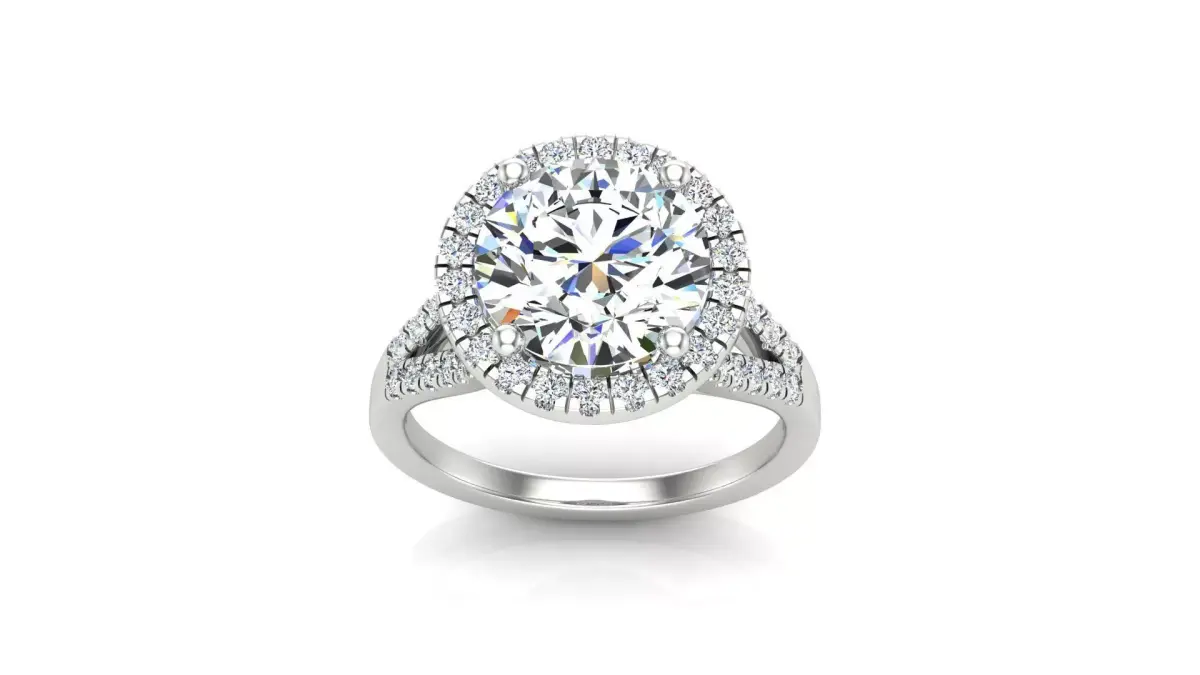 High-quality 3D model of an elegant halo engagement ring with a large central round gemstone surrounded by small pavé-set diamonds. The model features a split shank design and is ready for 3D printing and jewelry casting. Suitable for rendering, visualization, or production.