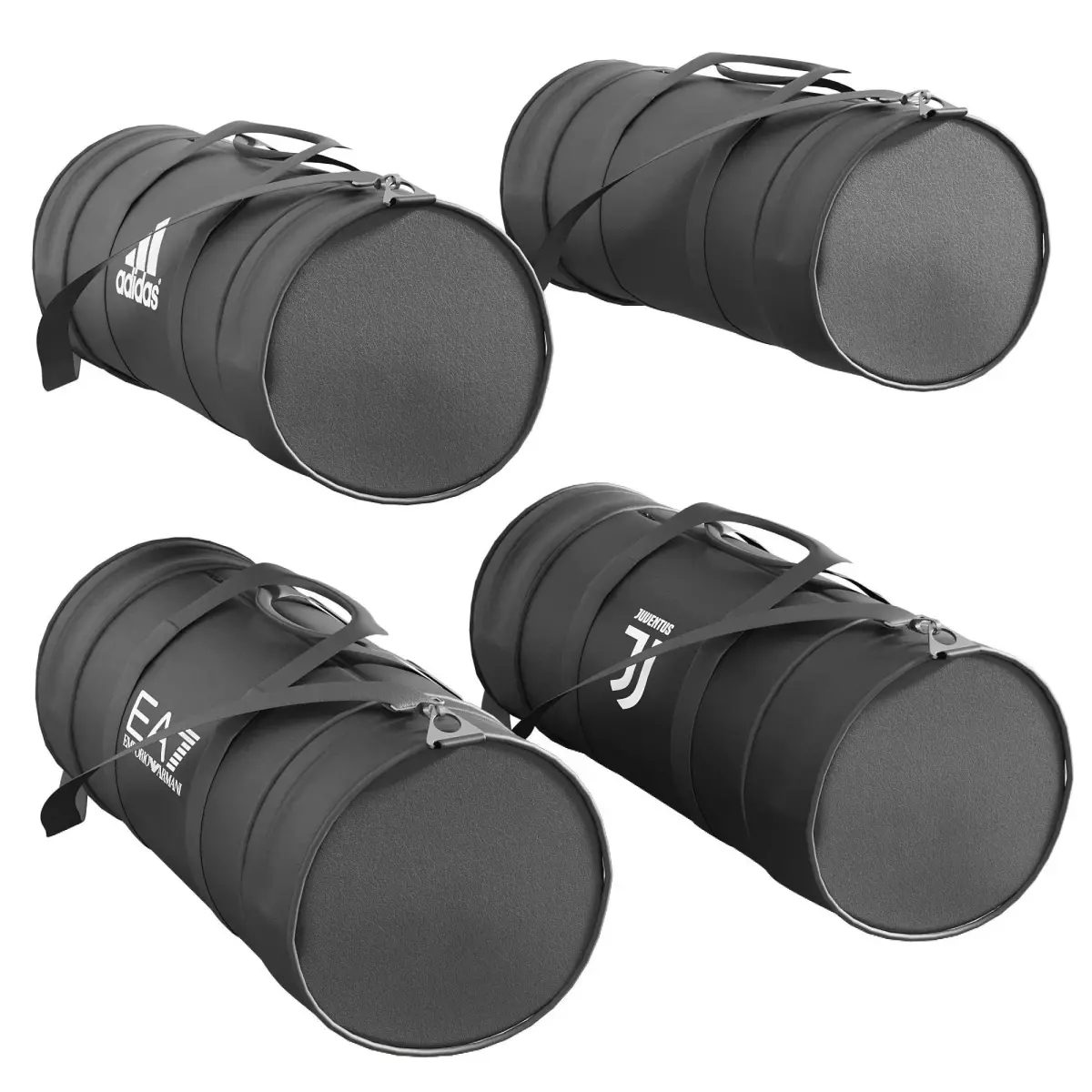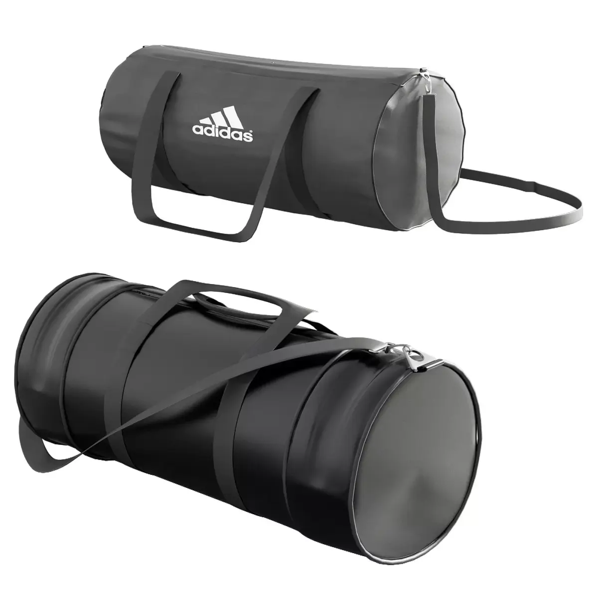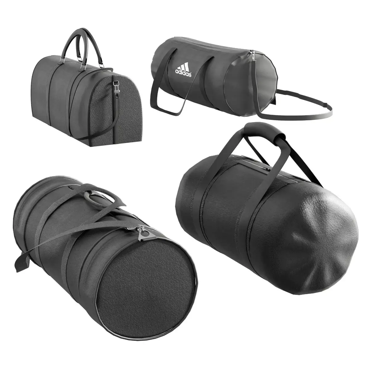 A comprehensive 3D model pack featuring4 different sport and travel duffle bags with a variety of shapes and textures, materials (leather, fabric, synthetic), and colors, including options with printed brand logos like Adidas and EA Sports. Each bag is optimized for use in interior or product visualization scenes.