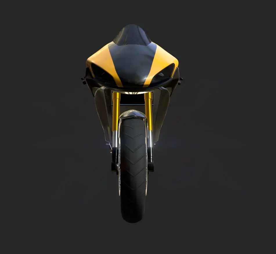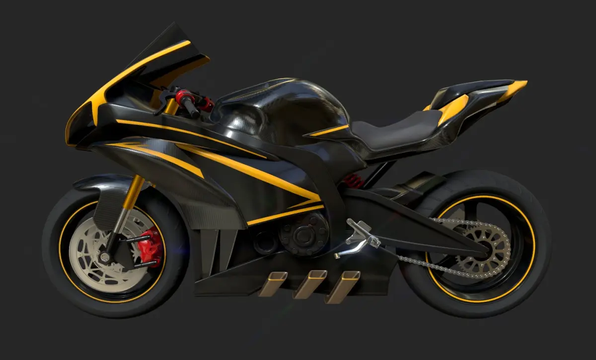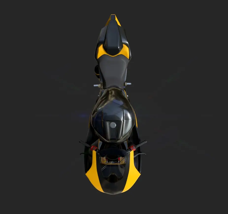 A sport bike with a striking yellow and black color scheme, custom racing decals, and a carbon fiber body, built for performance and style in the current timeline.PBR model Render ready