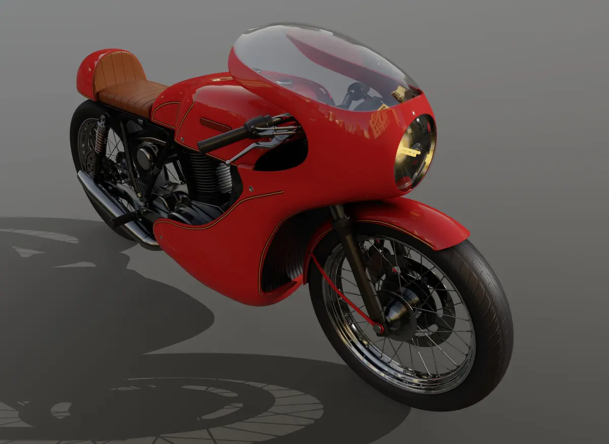 A sleek and fast sport bike from the historical timeline, designed for civilian use on the roads. This motorcycle features a vibrant red color with chrome accents, a curved aerodynamic shape, and a smooth leather seat, perfect for long rides through the city.