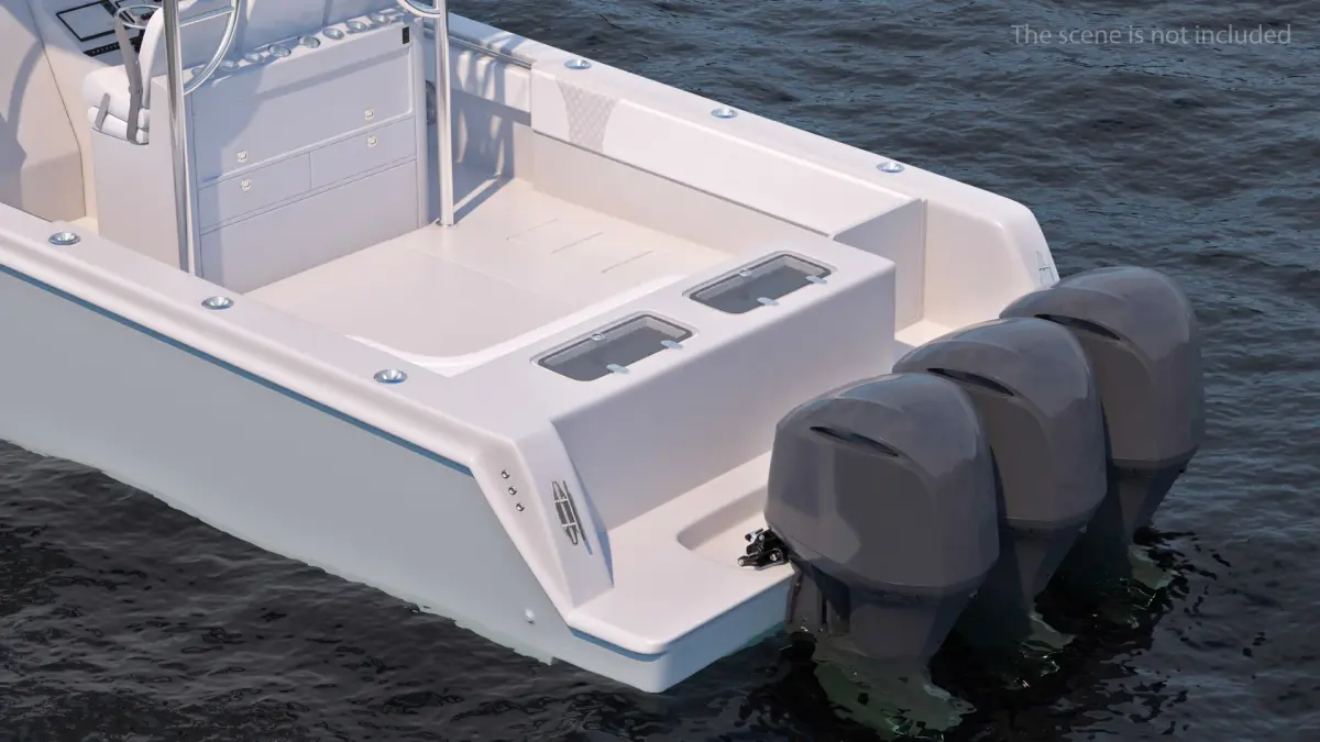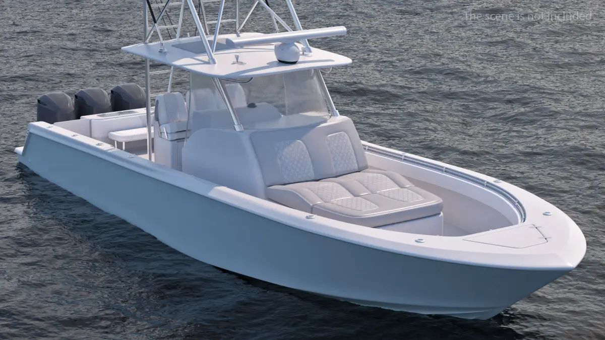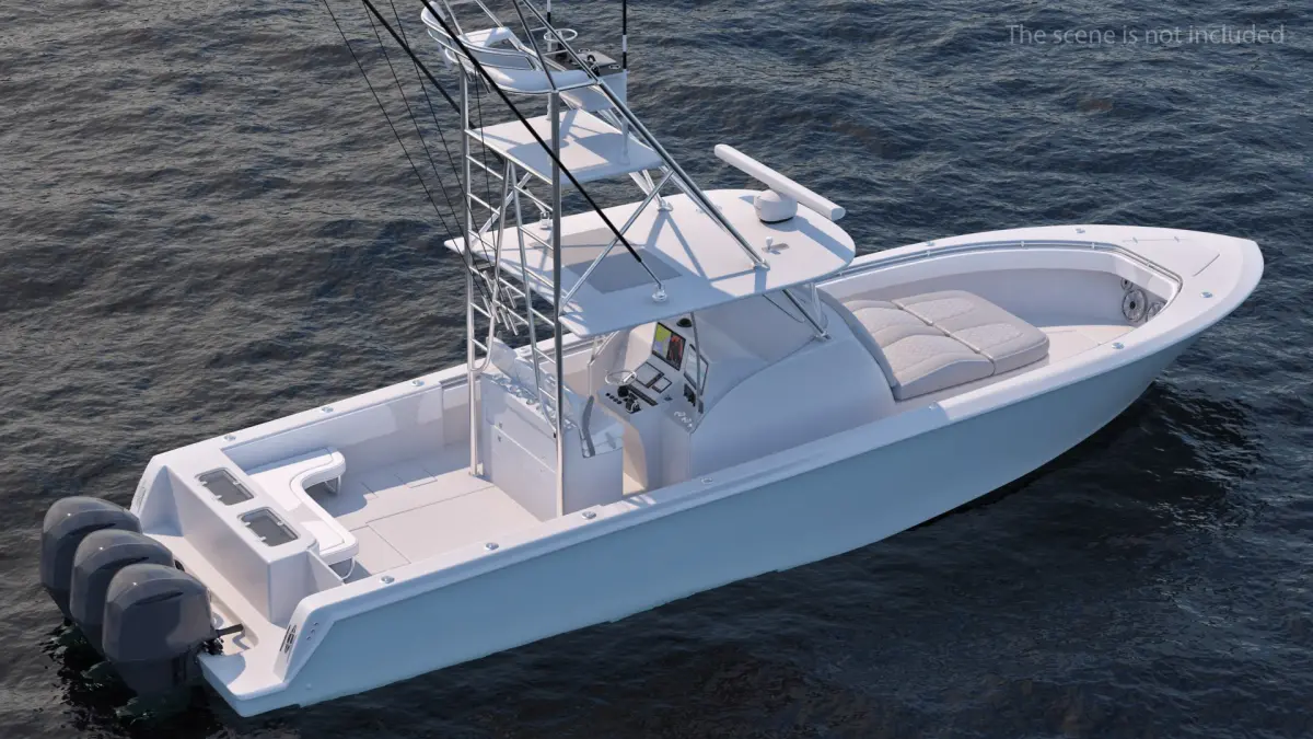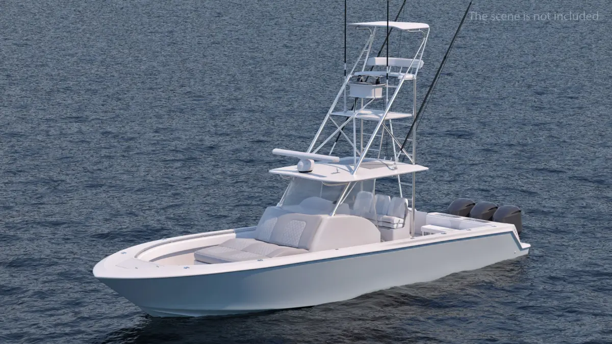 The model features detailed components including the hull, deck, cabin, seating, rod holders, and outboard or inboard engine mounts.