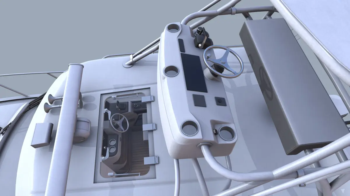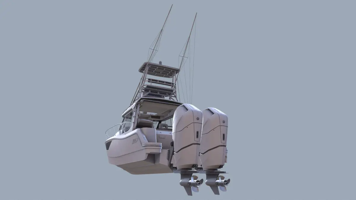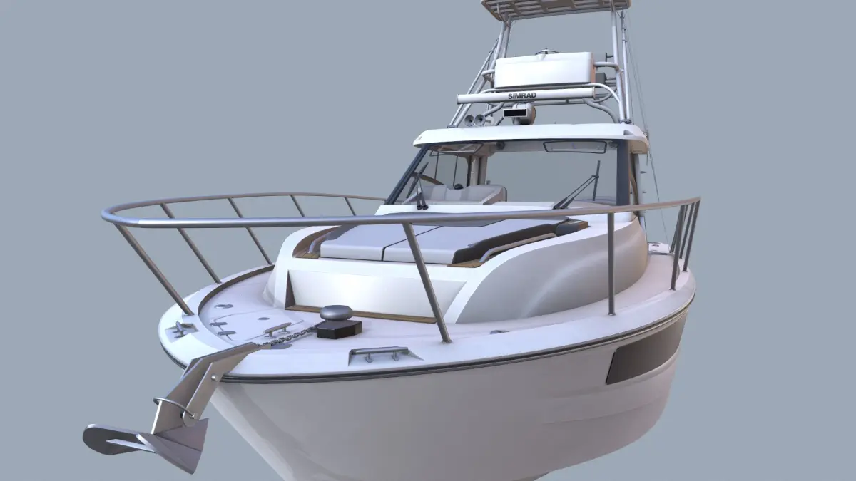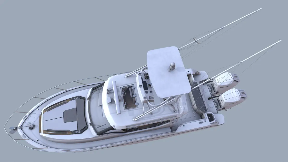 This is a 3D model of the Boston Whaler 365 Conquest—a powerful, stylish, and comfortable boat designed for offshore fishing. The model also includes a detailed interior.